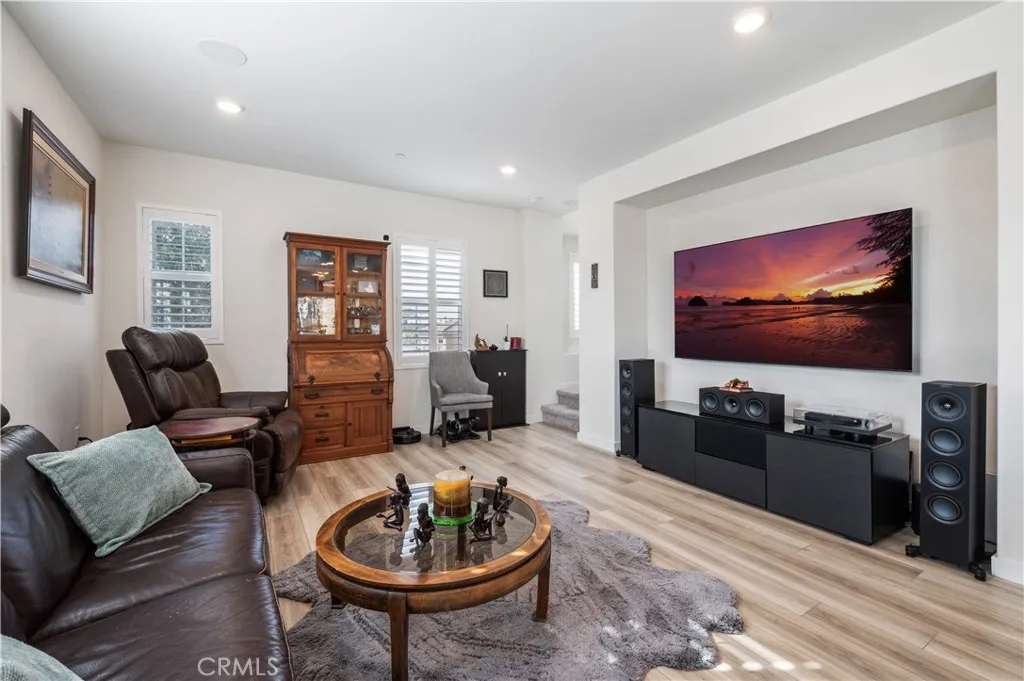 The main living level features an open-concept layout with wide-plank flooring, recessed lighting, and abundant natural light throughout. The spacious living and dining areas flow seamlessly into a contemporary kitchen complete with upgraded cabinetry, quartz countertops, stainless steel appliances, a large center island with seating, and designer lighting and fixture upgrades – ideal for both everyday living and entertaining.