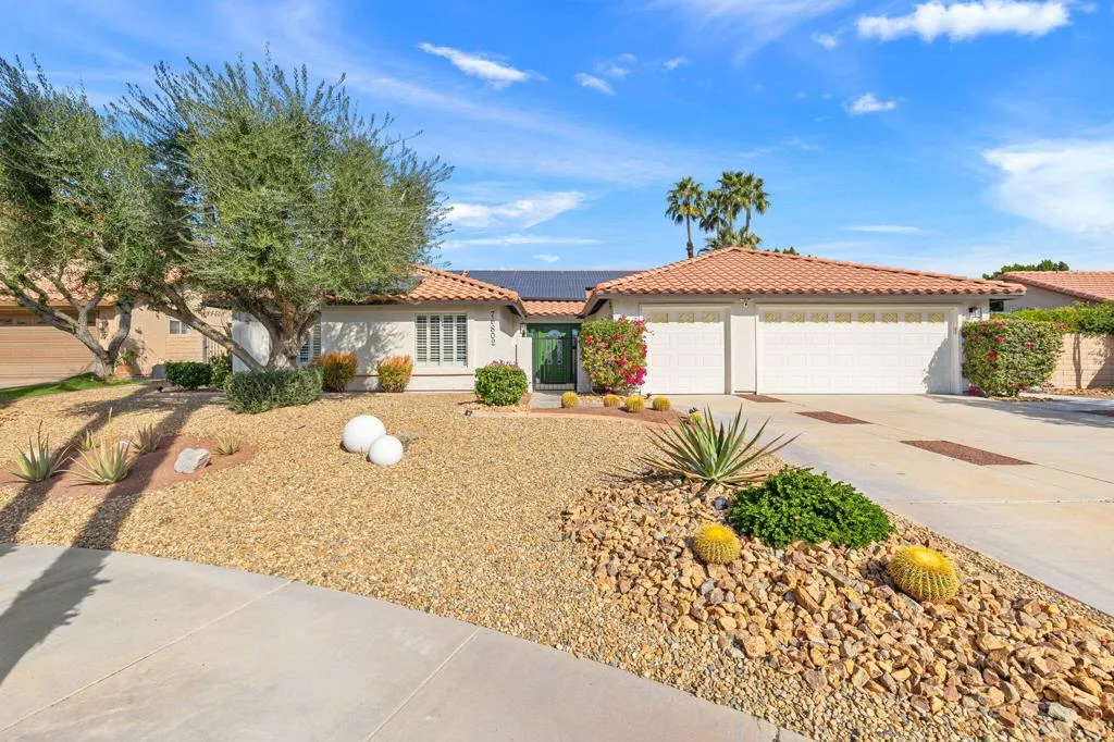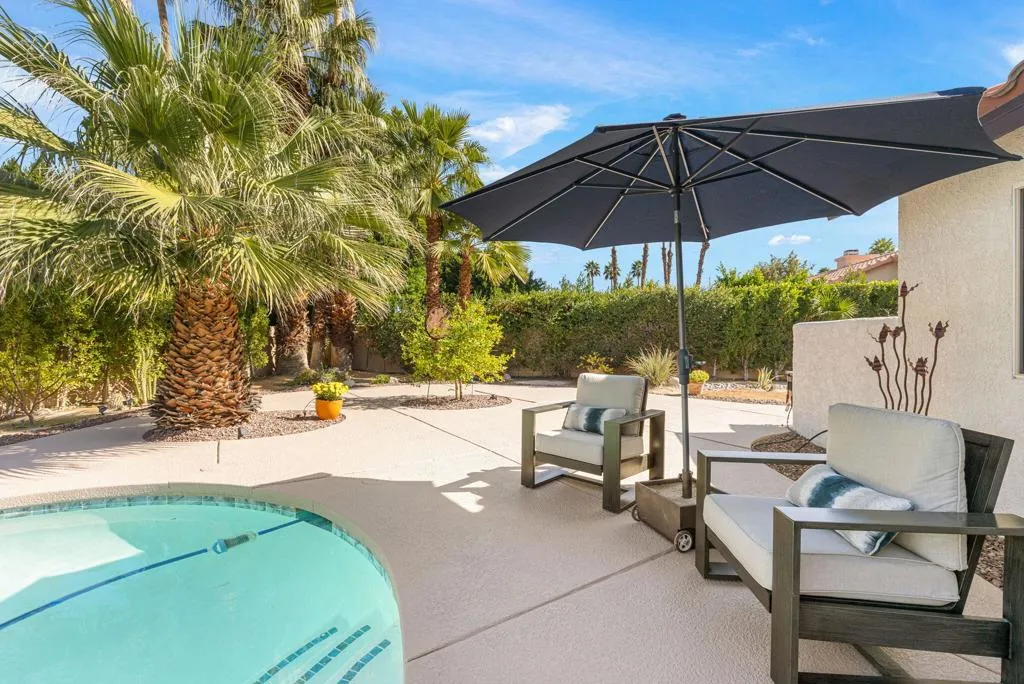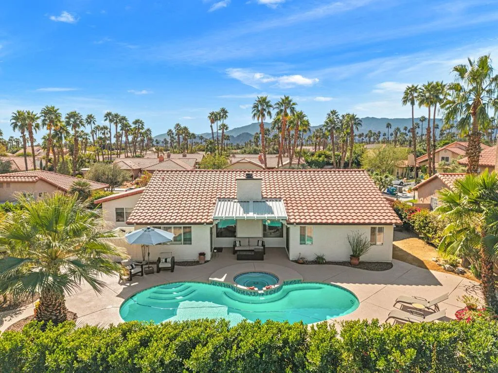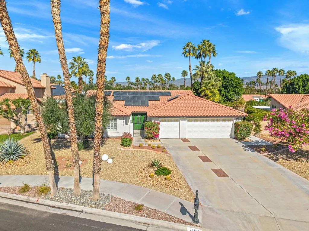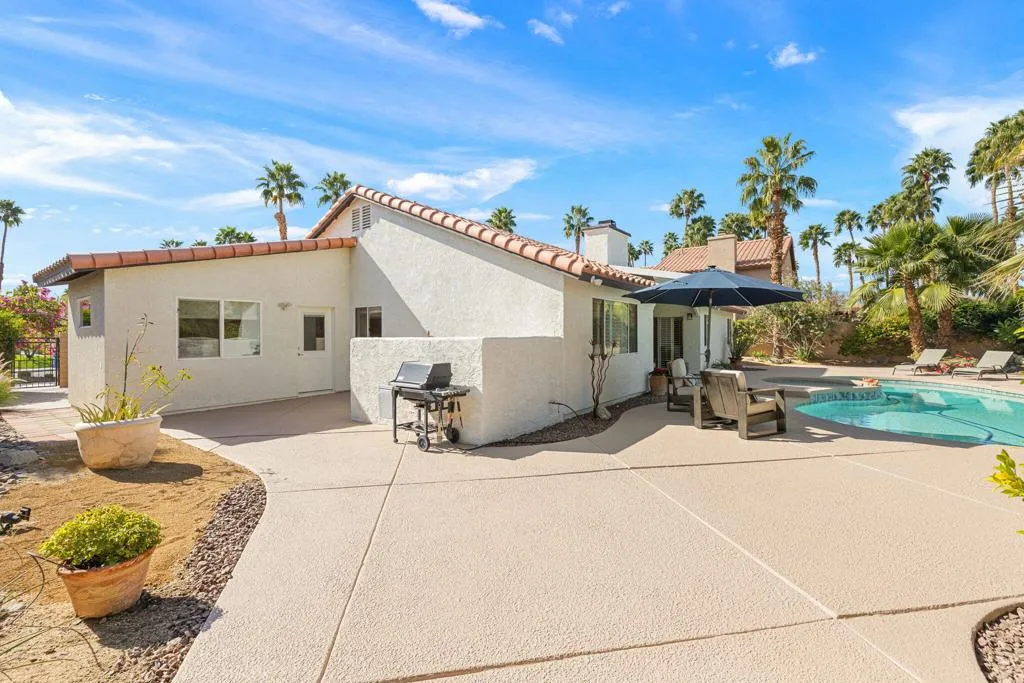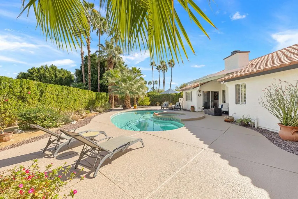 Located in the gated community of Regency Palms in Palm Desert, this beautifully updated single-family home offers 4 bedrooms and 3.25 bathrooms with a spacious open-concept design and vaulted ceilings that create a bright, airy feel throughout the main living areas. The kitchen is thoughtfully designed with a large center island, new appliances, abundant cabinetry, and a seamless connection to the living and dining spaces, creating the perfect setting for both everyday living and effortless entertaining. New carpet adds a fresh, modern touch, while newly completed landscaping in both the front and back yards enhances the home’s overall appeal. The primary suite offers a true sense of retreat, featuring a renovated bathroom with a soaking tub and walk-in shower, along with a redesigned walk-in closet that provides both style and functionality. Step outside to a private backyard designed for enjoying the best of desert living, complete with a pool, spa, and freshly painted deck that is ideal for relaxing evenings or hosting friends and family. Additional highlights include a two-car garage plus a separate golf cart garage with recently epoxied floors, and low monthly HOA dues that include cable and Wi-Fi. With its upgrades, thoughtful improvements, and prime Palm Desert location, this home offers comfort, efficiency, and lifestyle all in one. FULLY OWNED AND PAID SOLAR – 30 Panels. Additional information regarding updates and improvements in the public documents.