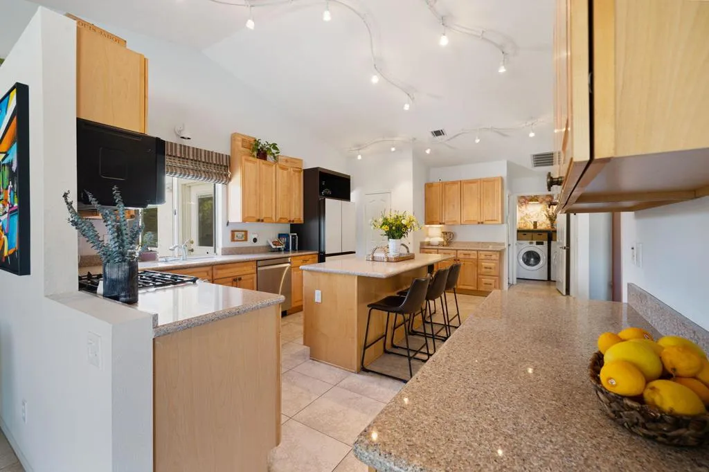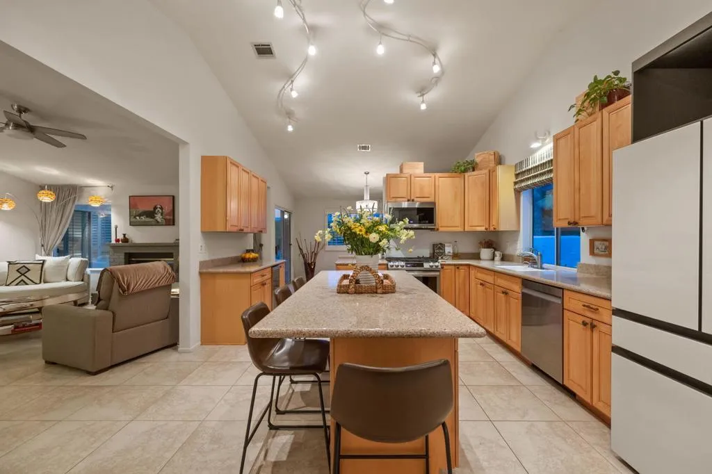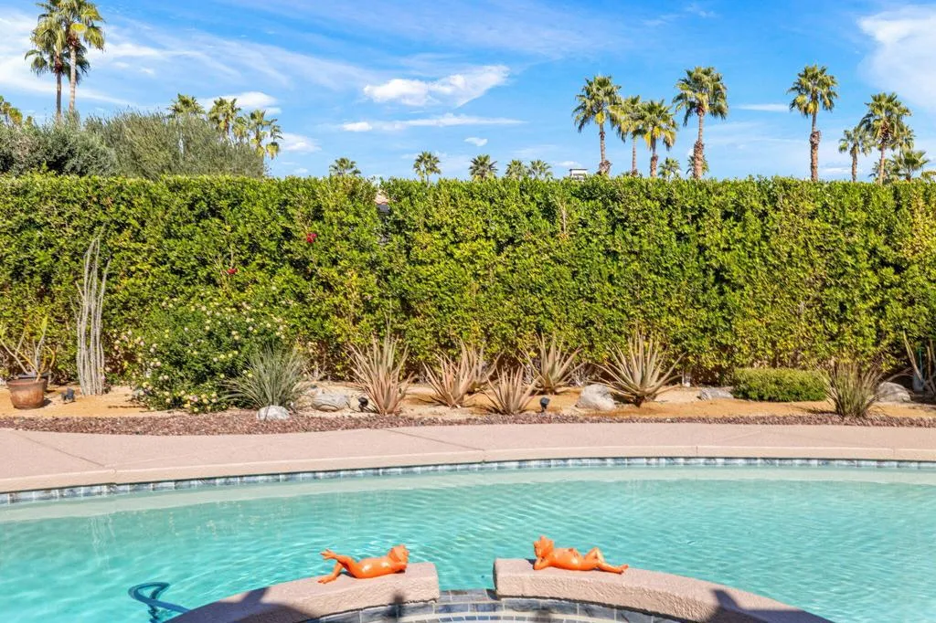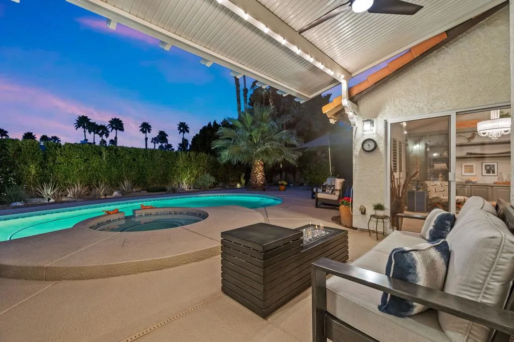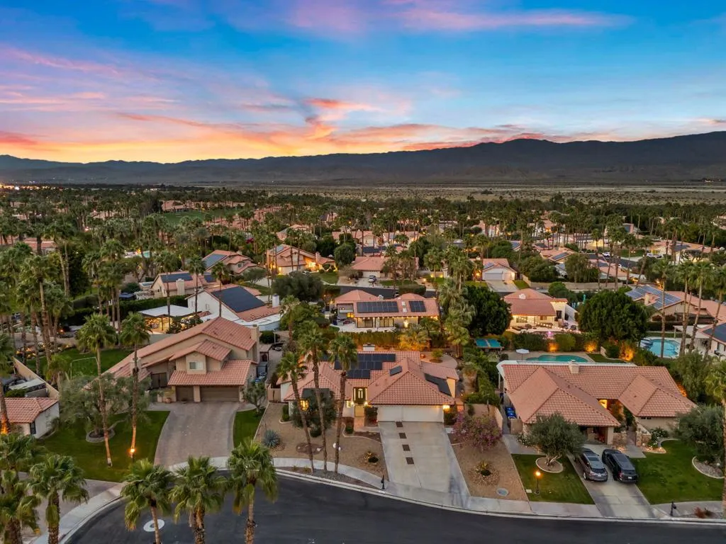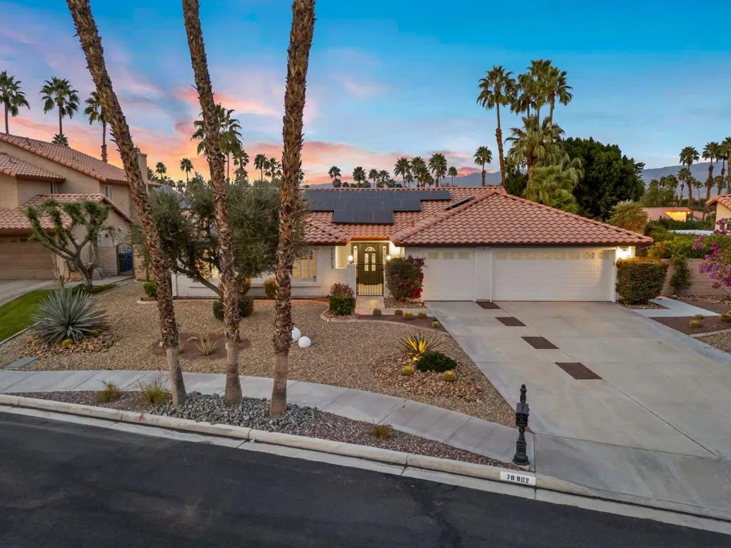 Located in the gated community of Regency Palms in Palm Desert, this beautifully updated single-family home offers 4 bedrooms and 3.25 bathrooms with a spacious open-concept design and vaulted ceilings that create a bright, airy feel throughout the main living areas. The kitchen is thoughtfully designed with a large center island, new appliances, abundant cabinetry, and a seamless connection to the living and dining spaces, creating the perfect setting for both everyday living and effortless entertaining. New carpet adds a fresh, modern touch, while newly completed landscaping in both the front and back yards enhances the home’s overall appeal. The primary suite offers a true sense of retreat, featuring a renovated bathroom with a soaking tub and walk-in shower, along with a redesigned walk-in closet that provides both style and functionality. Step outside to a private backyard designed for enjoying the best of desert living, complete with a pool, spa, and freshly painted deck that is ideal for relaxing evenings or hosting friends and family. Additional highlights include a two-car garage plus a separate golf cart garage with recently epoxied floors, and low monthly HOA dues that include cable and Wi-Fi. With its upgrades, thoughtful improvements, and prime Palm Desert location, this home offers comfort, efficiency, and lifestyle all in one. FULLY OWNED AND PAID SOLAR – 30 Panels. Additional information regarding updates and improvements in the public documents.