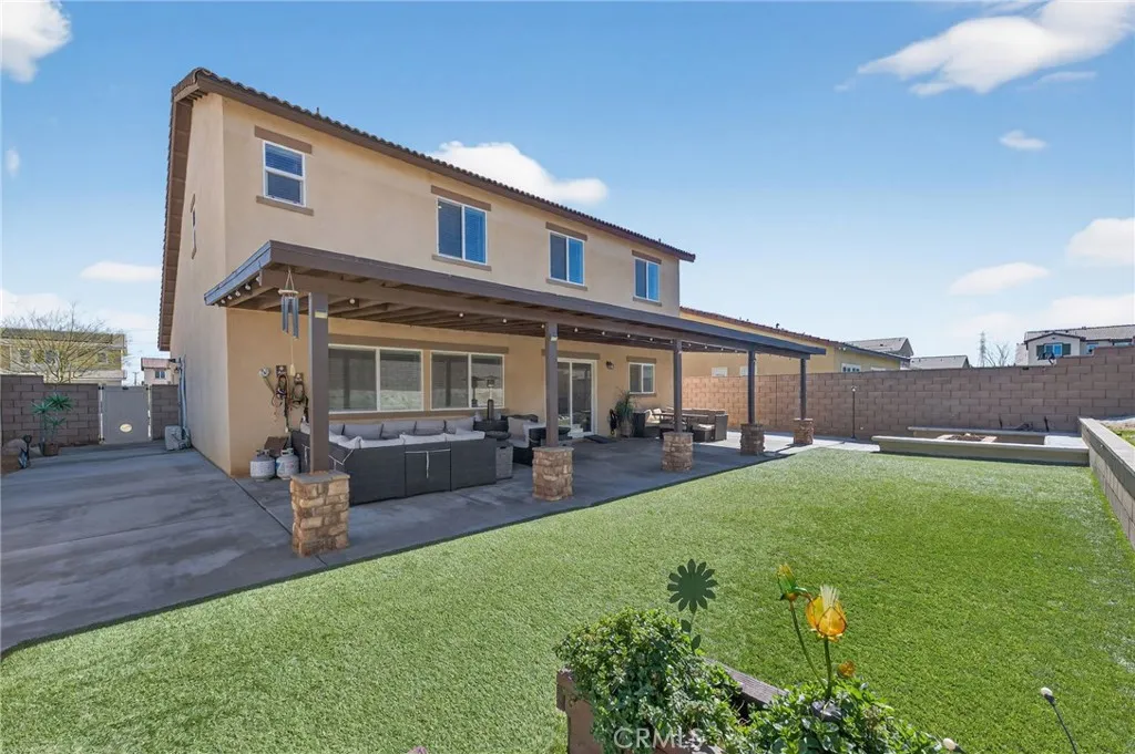 Step outside to a fully finished, low-maintenance backyard complete with a concrete patio, artificial turf landscaping, a wooden patio cover, and a gas-connected outdoor fireplace, creating an inviting space for year-round entertaining and relaxation.