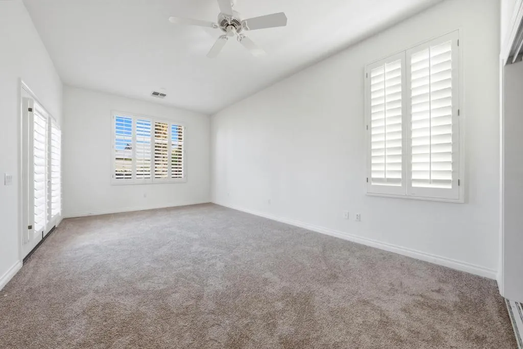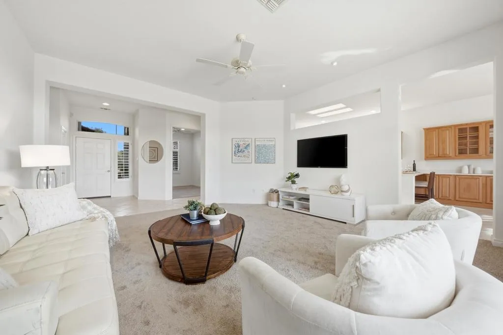 Sun City Palm Desert – Tangier. Located a short distance to the Lakeview Recreation Center, , this extended Tangier floorplan offers one of those views that stops you in your tracks. Positioned to capture spectacular southeast-facing vistas down the long par-5 7th fairway, the setting delivers sweeping panoramas of the golf course, surrounding mountains, and over 100 palm trees. The rear yard is designed for relaxed desert living, featuring a spacious patio with multiple seating areas–perfect for entertaining or simply soaking in the scenery. Out front, a gated courtyard with patio adds both curb appeal and function, surrounded by lush desert landscaping accented with mature palms. Inside, 10-foot ceilings and transom windows create a light, open feel throughout. Diagonal-laid tile flooring is used extensively, enhancing the home’s clean, cohesive design. The kitchen is well appointed with extensive raised-panel cabinetry, inset glass accents, pull-out shelves, corian countertops, a breakfast bar, and charming recipe windows. A large eating area with sliding glass doors connects seamlessly to the rear patio. The spacious living room enjoys uninterrupted fairway views, while double doors off the main hallway lead to a flexible den or office. The primary suite features a bay window, generous walk-in closet, and ensuite bath with dual sinks, cultured marble surfaces, and a stall shower. An extended guest bedroom offers French doors to the front courtyard and a nearby bath with tub/shower. Shutters accent the guest bedroom and den for added style and comfort. Additional highlights include indoor laundry with extra storage, a two-car garage with golf cart parking nook, new A/C (2019), and new water heater (2022). A rare combination of floorplan, upgrades, and unforgettable views–this is Sun City living at its finest.