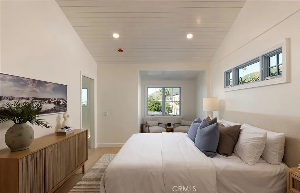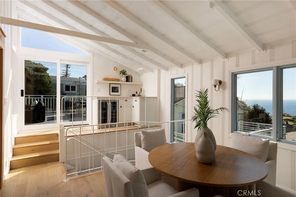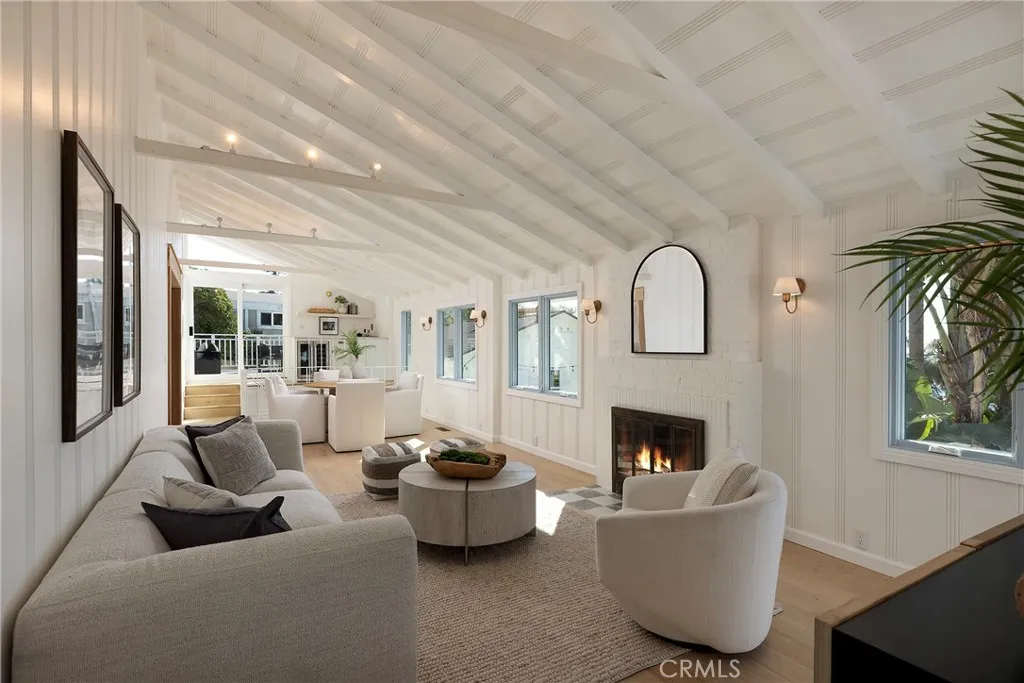 Perched above the shoreline in South Laguna Village, this newly remodeled coastal residence captures sweeping ocean and Catalina Island views, offering a refined yet relaxed expression of Laguna Beach living just moments from iconic Thousand Steps Beach. Spanning approximately 2,055 square feet, the three-bedroom, two-and-one-quarter-bath home has been thoughtfully reimagined to balance modern comfort with timeless coastal character. Natural light welcomes you on the entry level, where a gracious foyer opens to a generous family room enhanced by custom built-ins and an easy indoor-outdoor connection. Two well-appointed secondary bedrooms are located on this level—one opening directly to the backyard—along with a combined bath and laundry area designed for both function and flow. Upstairs, the home unfolds into a bright, open living environment defined by vaulted, wood-beamed ceilings and effortless entertaining spaces. The designer kitchen serves as the heart of the home, featuring white inset cabinetry, quartz countertops, a striking bookmatched quartz backsplash, new Thermador appliances, and a center island with bar seating. A pass-through serving window opens to an expansive ocean-view deck—ideal for al fresco dining, sunset gatherings, and coastal evenings overlooking the Pacific. The kitchen flows seamlessly into the dining area and a fireplace-warmed living room finished with classic Laguna Beach siding, opening to a second balcony that frames coastline views and includes stairs leading down to the side yard. The primary suite is a tranquil retreat, capturing ocean vistas and offering a sitting area, flexible open space ideal for an office or private lounge, and an ensuite bath with marble countertops. Throughout the home, white oak hardwood flooring, custom white oak cabinetry, curated hardware, and designer lighting create a cohesive, understated aesthetic. Additional highlights include a freshly painted exterior, all-new casement windows, shutters, charming wood flower boxes, and a two-car attached garage with a custom mahogany wood door. Tucked away on a quiet cul-de-sac, this South Laguna residence embodies relaxed coastal elegance—where panoramic views, thoughtful design, and proximity to the beach come together in one of Laguna Beach’s most desirable seaside settings.