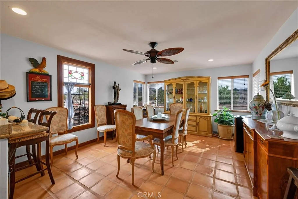 The kitchen includes granite countertops, a center island, range, oven, microwave, dishwasher, and generous cabinetry. The dining and living areas flow seamlessly to French doors that open to patios positioned to capture the surrounding mountain and valley views with a lovely fountain.