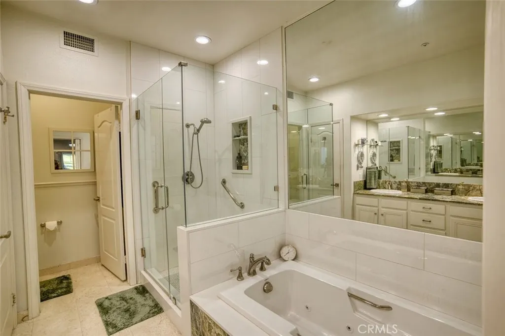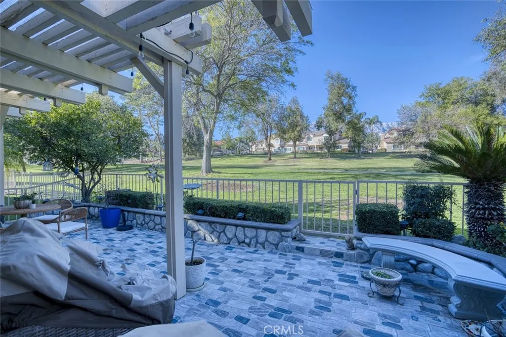 This beautifully upgraded SINGLE story condo, shows like a model home with over $50,000 in upgrades .This 2-bedroom plus an office that is being used as a third bedroom is move-in ready. Enhancements include a new roof, new dual-pane windows and sliding doors, updated flooring throughout, recessed lighting, fresh interior paint, new ceiling fan light fixtures, expanded kitchen cabinetry for additional storage, and a beautifully updated bathroom vanity and mirror. The luxurious primary suite features a soaking tub, walk-in closet, and a spa-inspired ambiance perfect for relaxing. The oversized three-car garage offers ample parking and storage space, including room for a golf cart, adding to the convenience of living in this golf course community. Enjoy outdoor entertaining with a built-in BBQ and take advantage of the peaceful, well-maintained surroundings that make Upland Hills such a sought-after place to call home. This exceptional property blends style, comfort, and location into one impressive offering.
