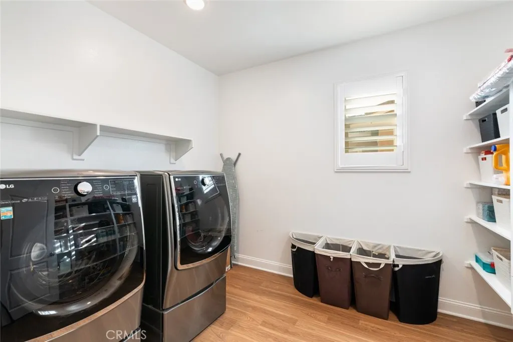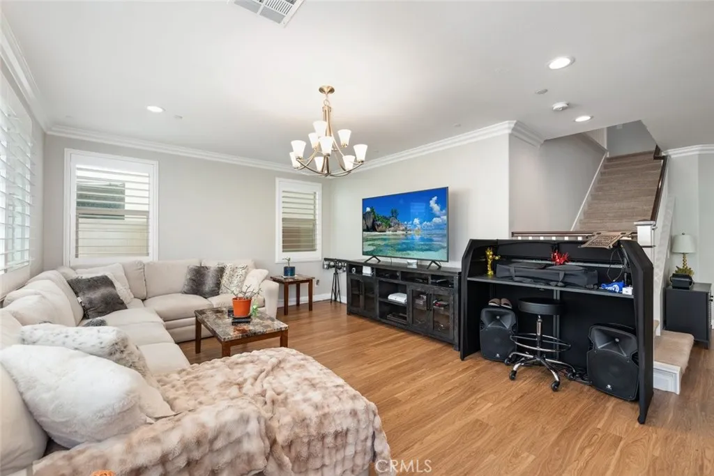 Inside, you’ll find laminate wood flooring throughout the downstairs, elegant plantation shutters, and crown molding that adds a refined touch throughout the home. The versatile floor plan includes a desirable downstairs bedroom and full bathroom, ideal for guests, multigenerational living, or a private office.