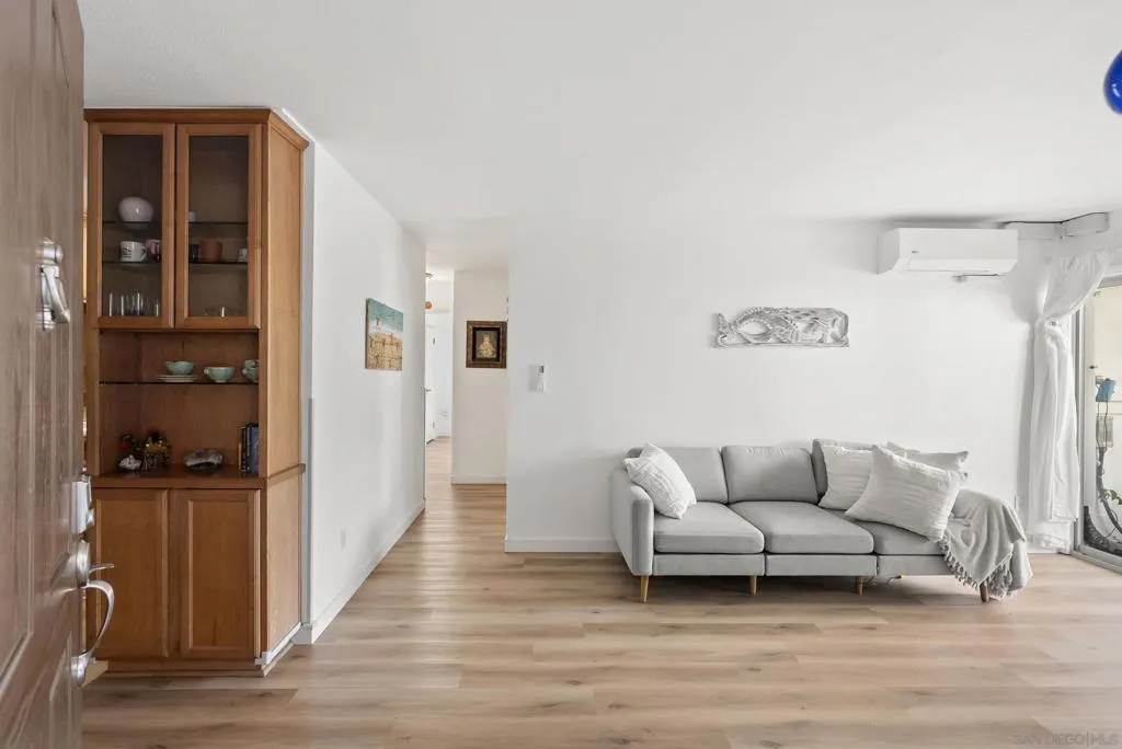 This exceptional, remodeled CORNER UNIT in the highly sought-after gated Pacific Pines Community offers a rare combination of privacy, tranquility, and sophisticated upgrades. This coveted 2-bedroom, 1-bathroom end unit is flooded with natural light thanks to extra windows unique to its prime corner location, and with only one shared wall instead of two, you’ll enjoy a level of privacy rarely found in condo living. Positioned away from the street, the peaceful setting ensures serene, quiet living throughout. Inside, thoughtful designer touches abound: luxury vinyl plank flooring flows throughout, complemented by custom light fixtures and stylish ceiling fans in every room, and a fully remodeled bathroom. The kitchen features stainless steel appliances, including a like-new Frigidaire refrigerator purchased less than a year ago. A true standout feature is the multi-zone mini-split AC and heating system, with individual splits in every room, an almost unheard-of amenity in this community offering personalized, year-round comfort. Additional highlights include a top-of-the-line LG ThinQ stacked front-load washer/dryer, a private outdoor patio with storage overlooking lush landscaping, and two generously sized bedrooms, one with a walk-in closet. The Pacific Pines lifestyle delivers it all: pool, spa, gym, recreation room, BBQ areas, tennis courts, scenic trails, and EV charging stations, just 2 miles from Annie’s Canyon Trail, 4 miles to Solana Beach and Cardiff dining, and 1 mile from the I-5. Coastal Encinitas living at it’s finest!