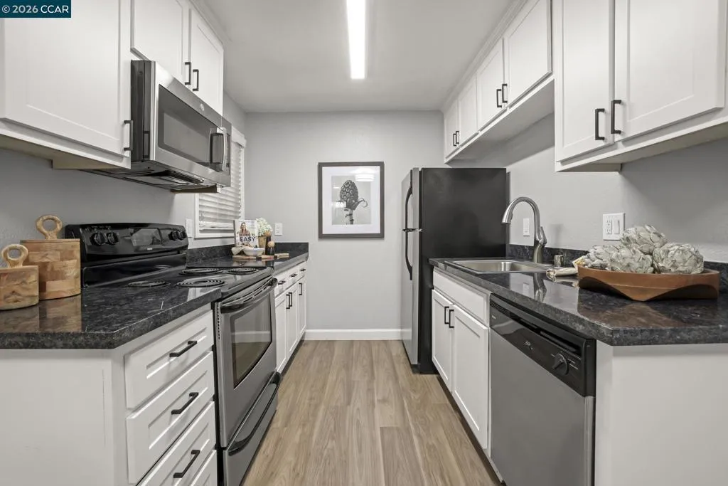 Welcome to this beautifully updated ground-floor condo offering comfort, convenience, and style, all with no steps to entry. Fresh designer interior paint and luxury vinyl plank flooring flow seamlessly throughout, creating a bright, modern feel. Dual pane windows enhance energy efficiency and comfort year-round. The updated kitchen features granite countertops, refreshed finishes, and updated lighting, making it both functional and inviting. A separate dining area provides the perfect space for everyday meals or entertaining guests. The renovated bathroom also showcases a granite countertop for a cohesive, upscale touch. The spacious bedroom includes new mirrored closet doors, enhancing both storage and natural light. Enjoy the ease of in-unit laundry and step outside to your private patio, complete with a large storage closet for added convenience. The community offers a sparkling swimming pool, relaxing spa, and clubhouse. Ideally located close to shopping and dining, this home provides easy access to everyday essentials and local favorites. An excellent opportunity for a first-time homebuyer or investor seeking a move-in ready, low-maintenance property.