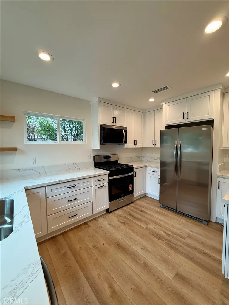The fully renovated kitchen is a true centerpiece, showcasing sleek new cabinetry, quartz countertops, stainless steel appliances, and contemporary fixtures. Each of the three bathrooms has been beautifully remodeled with modern vanities, updated tile work, and stylish finishes, not to mention a designated Laundry Room.