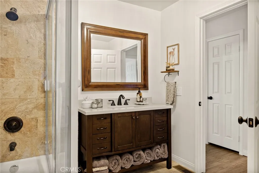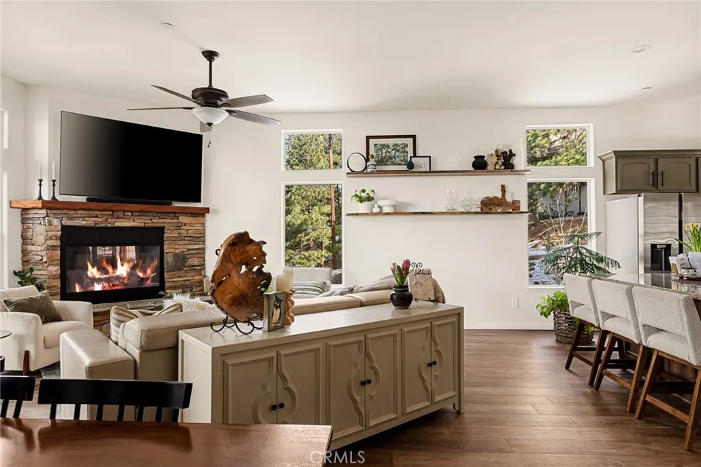 SPECTACULAR MODERN MOUNTAIN HOME! Welcome to this immaculate 3-bedroom, 2-bath home offering a breathtaking sunset & city lights view and exceptional pride of ownership throughout. Whether you’re seeking a full-time residence or a serene vacation getaway, this beautifully maintained property delivers comfort, functionality, and unforgettable surroundings. Located close to Hwy 330 making a daily commute down the mountain a breeze. The home comes equipped with central heating, air conditioning, fully sprinklered fire protection system, tankless water heater and an attic fan. Upgrades include LVP flooring, ceiling fans, stacked stone fireplace, wood tread staircase and stainless steel appliances. Step inside to soaring 10-foot ceilings surrounded by windows that create natural light with an open, airy ambiance. The kitchen features an oversized island with a beautiful granite counter top and a downdraft range and oven along with Kraftmaid cabinets with self-closing drawers and doors. The MAIN-FLOOR PRIMARY BR offers convenience and privacy, with direct access to the spacious deck—perfect for enjoying morning coffee or evening sunsets overlooking the twinkling lights below. Upstairs, you’ll find two additional bedrooms connected by a Jack & Jill bathroom, along with a versatile loft area currently used as a home office—ideal for remote work or additional living space. The charming front porch adds warmth and curb appeal, while the large rear deck expands your living space outdoors. Inside laundry enhances everyday ease, and the attached two-car garage provides convenience and security. Rare for the mountain area, this property offers ample parking along with generous under-house storage—perfect for seasonal items and outdoor gear. The upgraded landscape design is as thoughtfully cared for as the home itself. Turnkey, exceptionally maintained, and designed for both everyday living and peaceful escapes—this is modern mountain living at its finest. Just minutes from Lake Arrowhead, Big Bear, Snow Valley Ski Resort, and hiking trails, this move-in ready property is perfect as a full-time home, vacation escape, or rental investment. Enjoy the quaint town of Running Springs with its markets, restaurants, shops, post office and library. Schedule your showing today and experience mountain living at its best!
