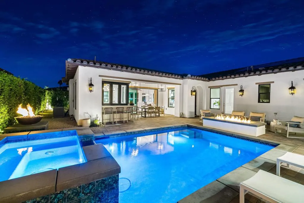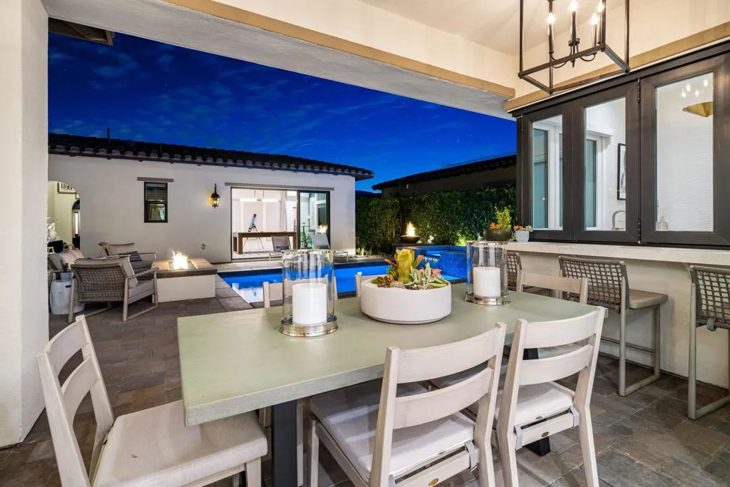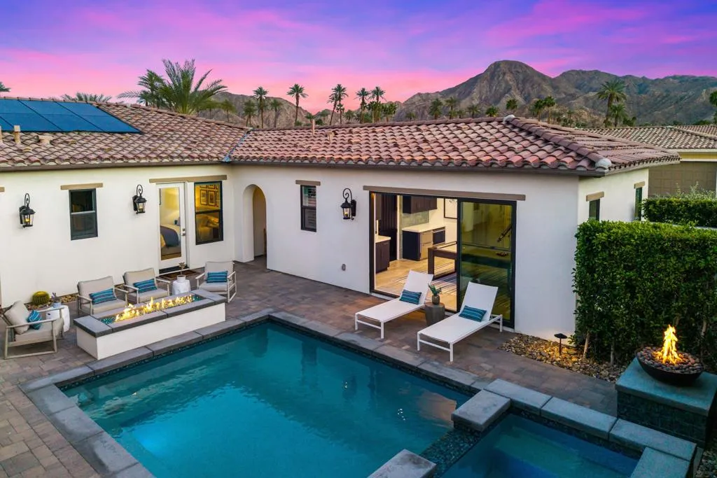 A rare offering in the heart of Indian Wells This extraordinary residence is a former developer’s model home with over $300,000 in original upgrades. It has been further reimagined and customized by the current owners for elevated comfort and timeless style.From the moment you enter , the home evokes romance of Europe. Designed so that the interiors gracefully embrace and surround the pool courtyard., creating an intimate, resort-like setting reminiscent of a private villa in the south of France or Tuscany. Walls of glass blur the lines between indoors and outdoor living , allowing natural light to cascade through the living spaces. Offering 4 bedrooms, plus separate office, 4.5 baths including a detached casita. Each suite is thoughtfully appointed delivering privacy and refinement for residents and guests.Designer finishes, upgraded cabinetry , premium appliances custom lighting and architectural detailing reflects it’s model home pedigree. Additional highlights include owned Solar for energy efficiency , two car garage plus golf cart garage with air conditioning and epoxy floors.. A separate storage room. The home is a smart home with all locks and systems controlled by an app on your phone, This stunning home is being offered designer furnished ( per inventory list)This is not just a home. It is a refined sanctuary designed for those who value intimacy, privacy and sophisticated, timeless elegance.