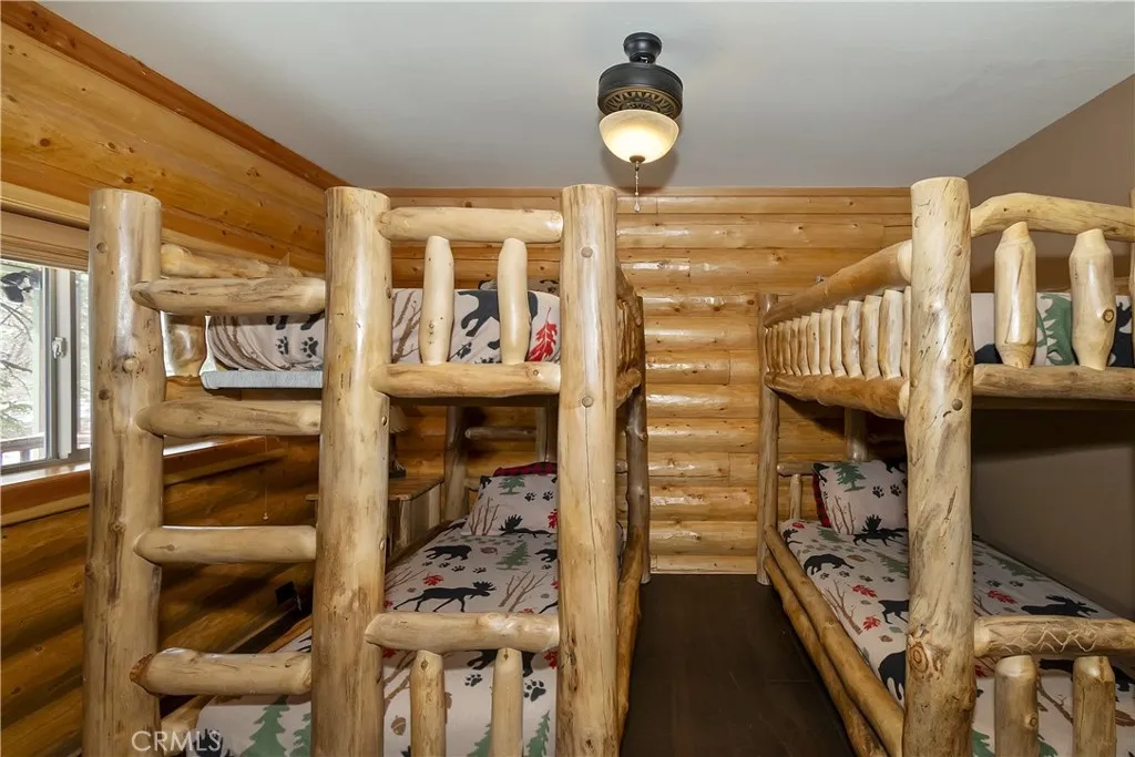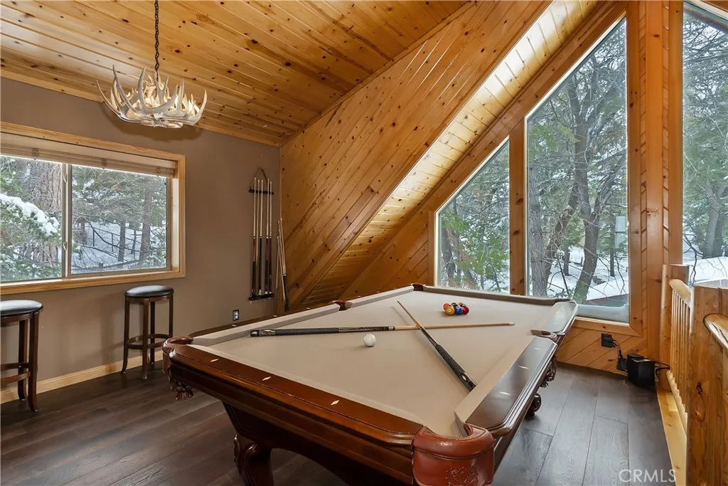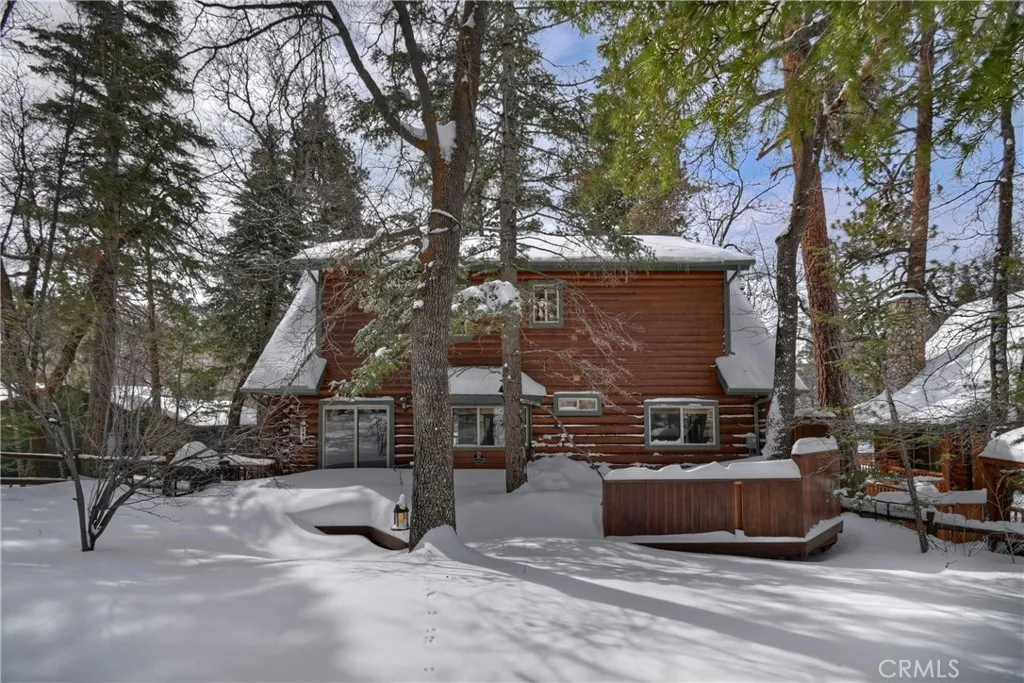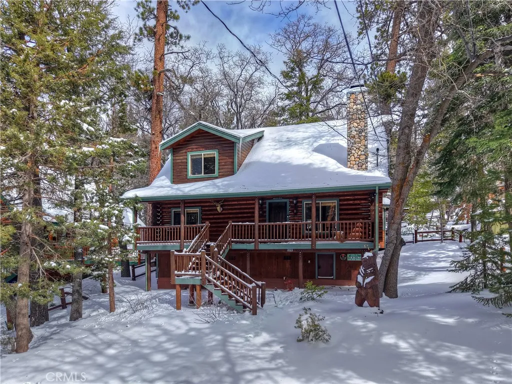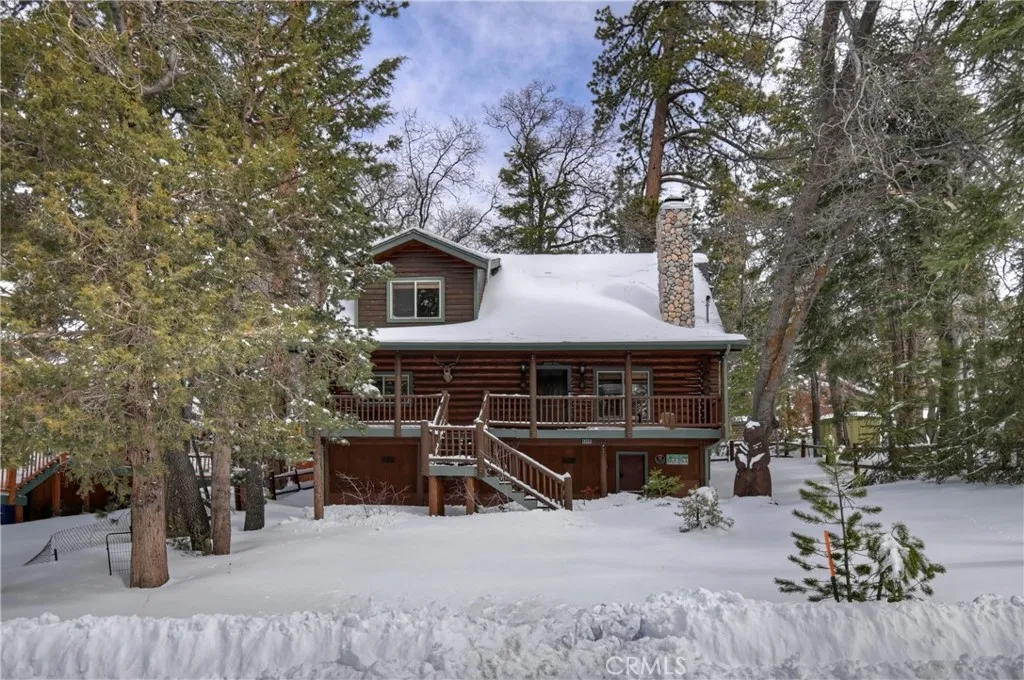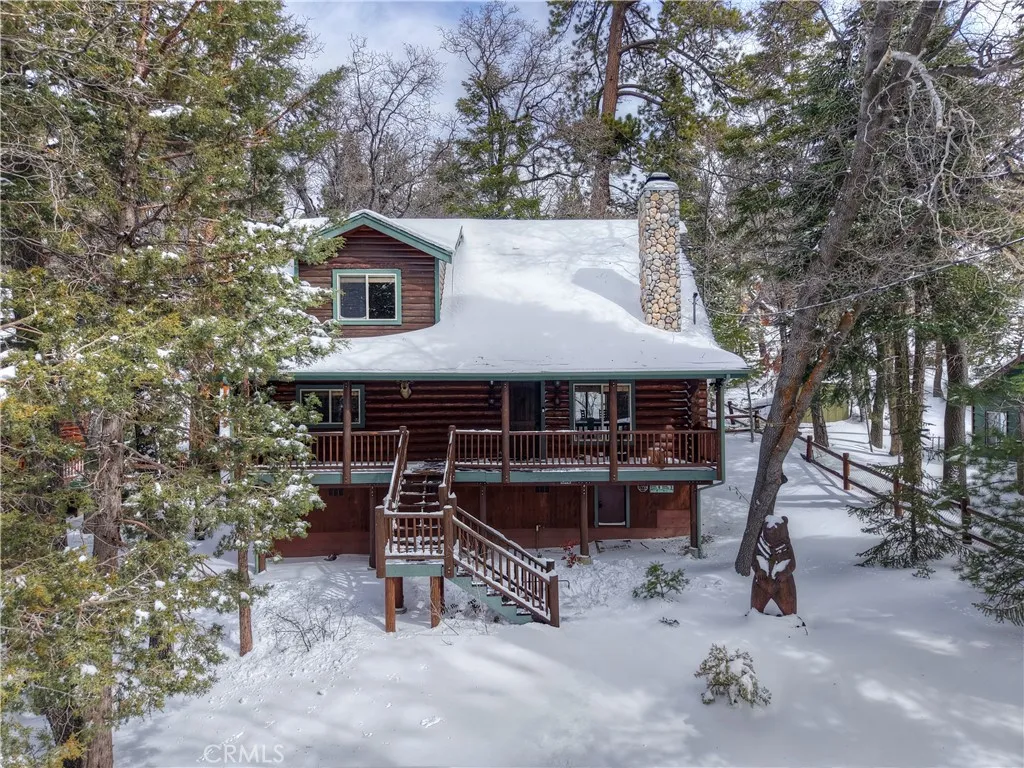 This is the true log cabin in the mountains you have been waiting for ~ Located in Moonridge and just a few minute drive to Bear Mountain ski slopes ~ Imagine yourself relaxing on your front deck taking in the sounds of nature and your peek-a-boo views of the ski slopes ~ As you enter you will fall in love with the soaring tongue and ceilings and the floor to ceiling river rock wood burning fireplace ~ Hardwood floors flow throughout the cabin ~ The main level gives you the open kitchen, dining area, living room, 2 bedrooms and a full bathroom ~ Upstairs is your large loft with pool table and the master bedroom with its own en suite bathroom and vaulted ceiling ~ The backyard is where the magic happens ~ You have your own private hot tub sunken in the deck, a paver walkway to a bridge taking you over the built in waterfall to a sitting area ~ Your own private park for relaxing and letting the stressors of everyday life just melt off your shoulders ~ This is your opportunity to finally have the quintessential cabin in the woods you have always dreamed of!