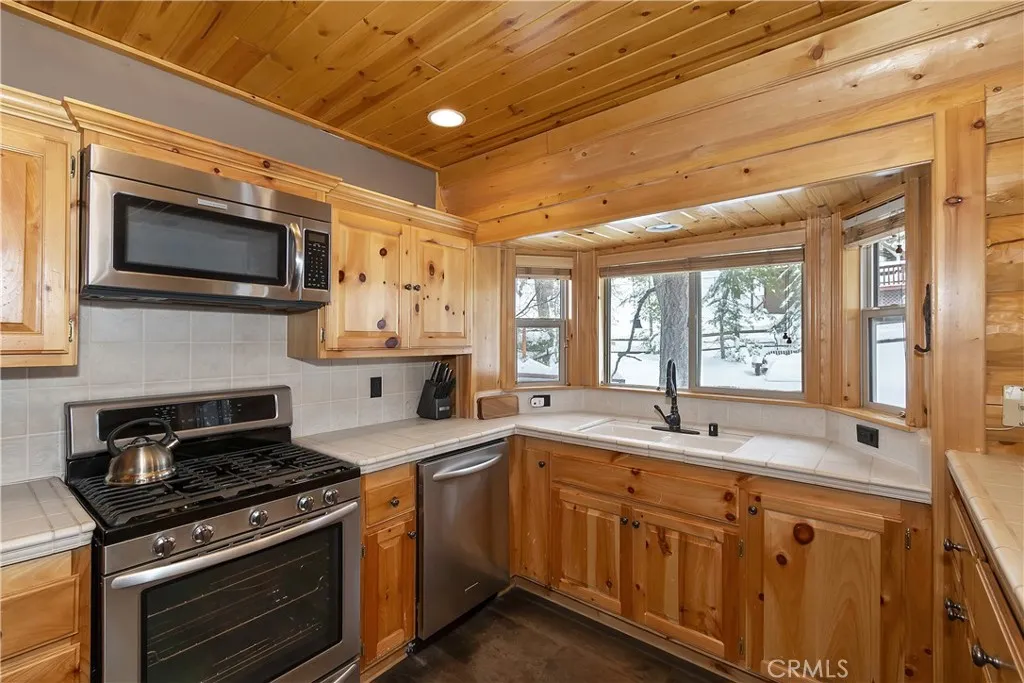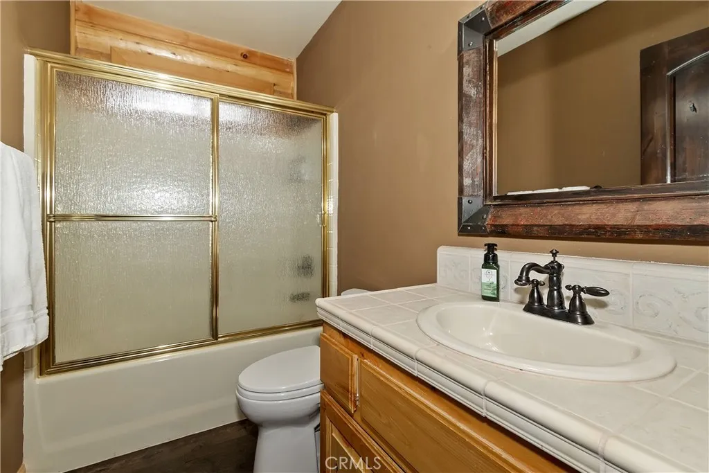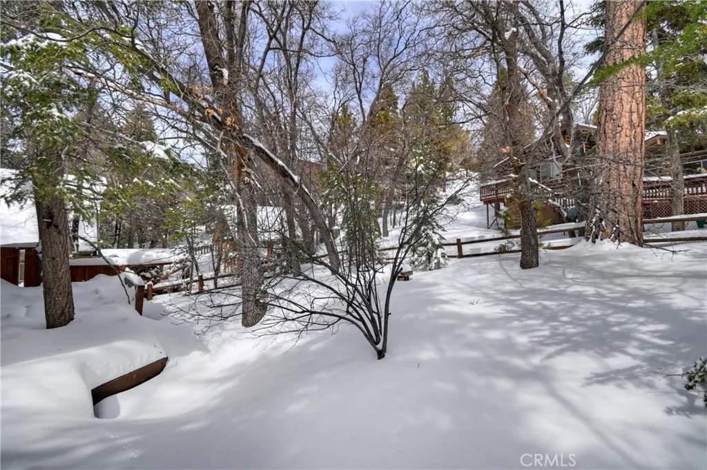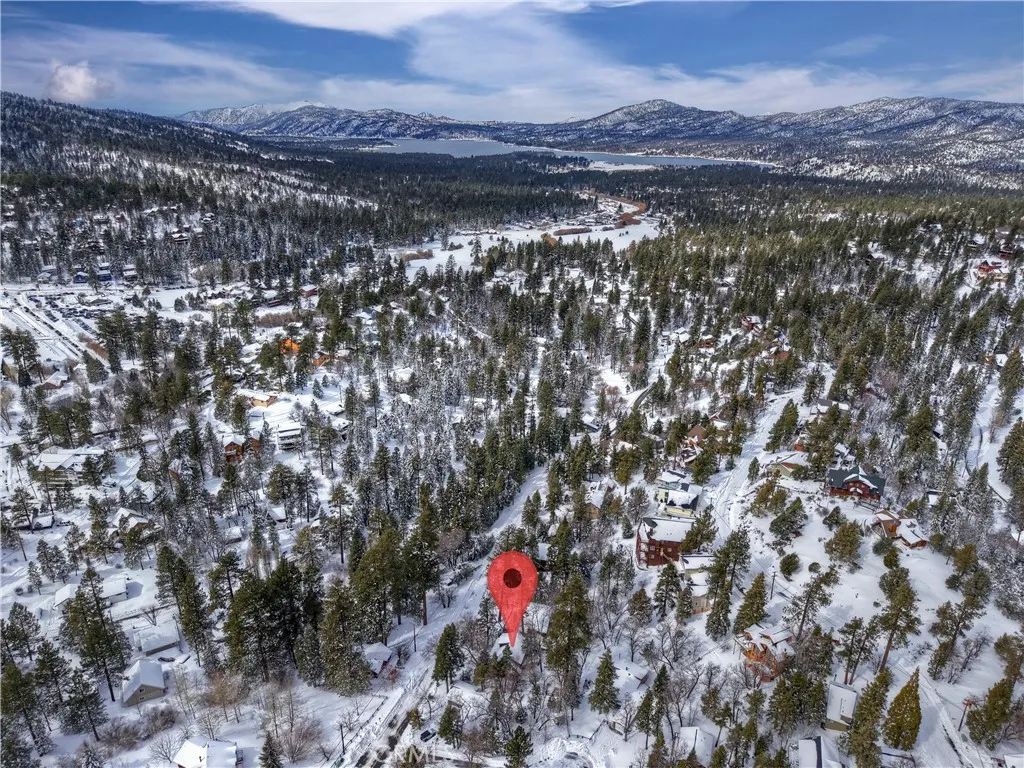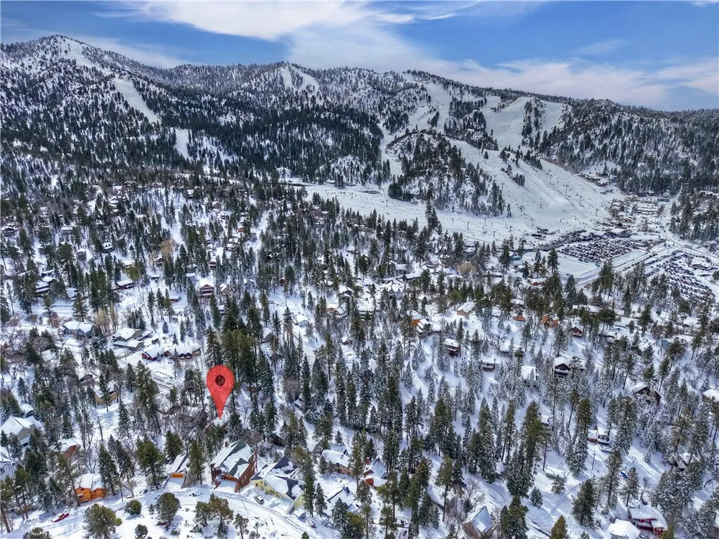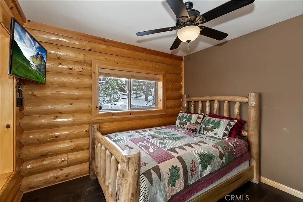 This is the true log cabin in the mountains you have been waiting for ~ Located in Moonridge and just a few minute drive to Bear Mountain ski slopes ~ Imagine yourself relaxing on your front deck taking in the sounds of nature and your peek-a-boo views of the ski slopes ~ As you enter you will fall in love with the soaring tongue and ceilings and the floor to ceiling river rock wood burning fireplace ~ Hardwood floors flow throughout the cabin ~ The main level gives you the open kitchen, dining area, living room, 2 bedrooms and a full bathroom ~ Upstairs is your large loft with pool table and the master bedroom with its own en suite bathroom and vaulted ceiling ~ The backyard is where the magic happens ~ You have your own private hot tub sunken in the deck, a paver walkway to a bridge taking you over the built in waterfall to a sitting area ~ Your own private park for relaxing and letting the stressors of everyday life just melt off your shoulders ~ This is your opportunity to finally have the quintessential cabin in the woods you have always dreamed of!