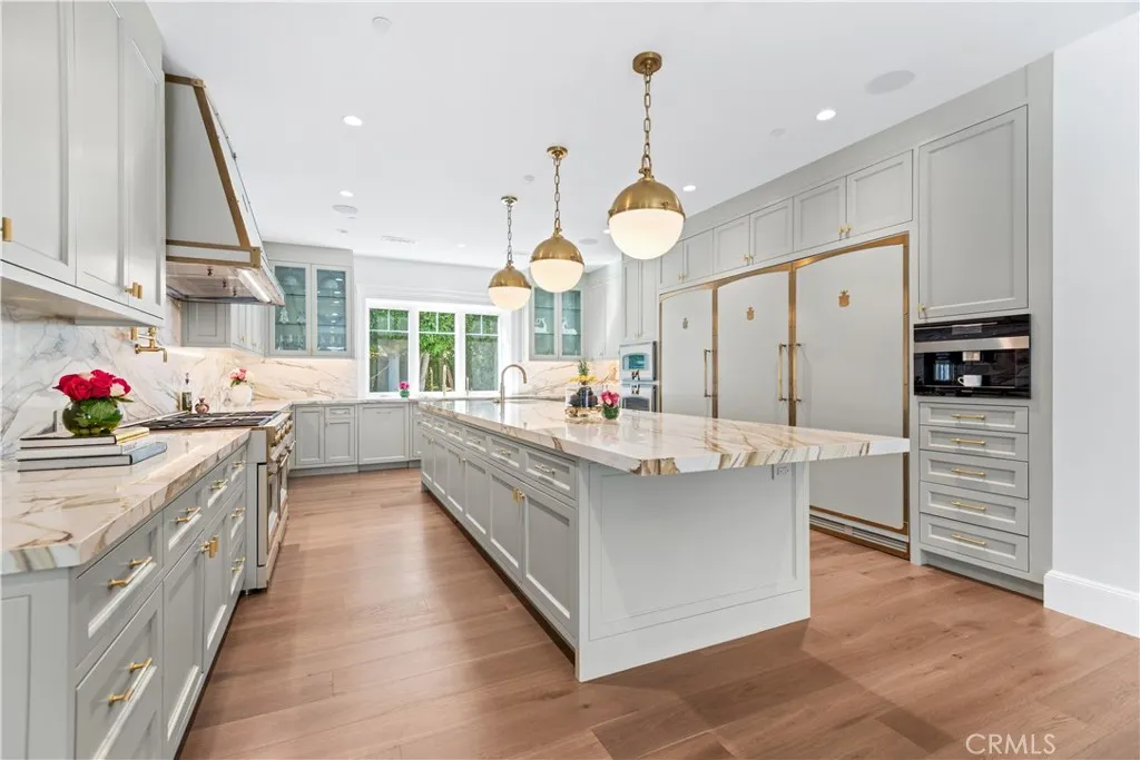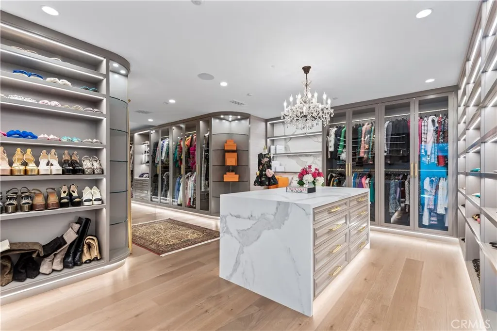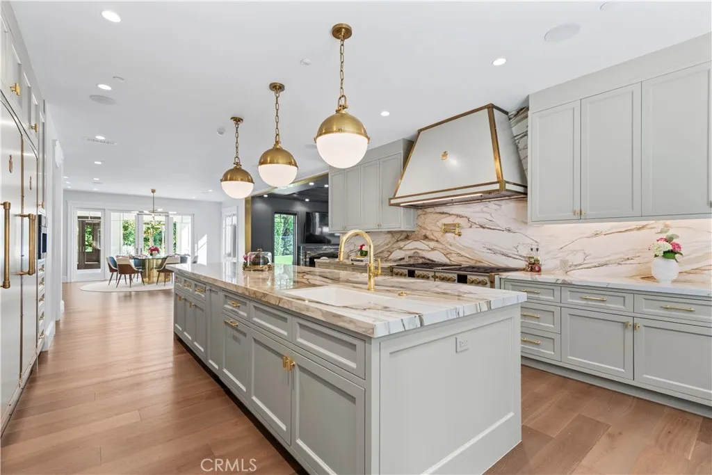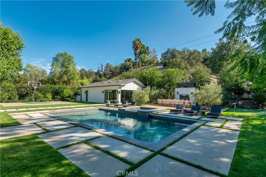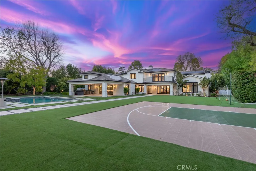 This model sharp and highly upgraded estate residence, complete with a new guest house, is sited on a superb 1.13 acre completely flat lot! Beautifully finished throughout, the home features a sunny open floor plan with a gorgeous, center island chef’s kitchen, big adjoining breakfast room, all wide open to the great room & lounge with wet bar & temperature controlled wine room, plus a custom study, home theater, and a superb primary suite with an all stone bath, steam shower, enormous, room sized closets and adjoining glam room. The expansive family room has sliding walls of glass that open to the big backyard, highlighted by a large covered entertaining patio with full barbecue center, a sparkling pool & spa, sports court, big lawn with fireplace & outdoor dining area, and a guest house complete with steam & sauna, all nestled amongst mature trees. Additional amenities include heated floors in all upstairs bathrooms, a voice activated smart home system, a central vacuum system, owned solar power system, whole house 48 kilowatt generator, and a four-car garage, complete with custom cabinetry and 220 volt wiring for electric car chargers.