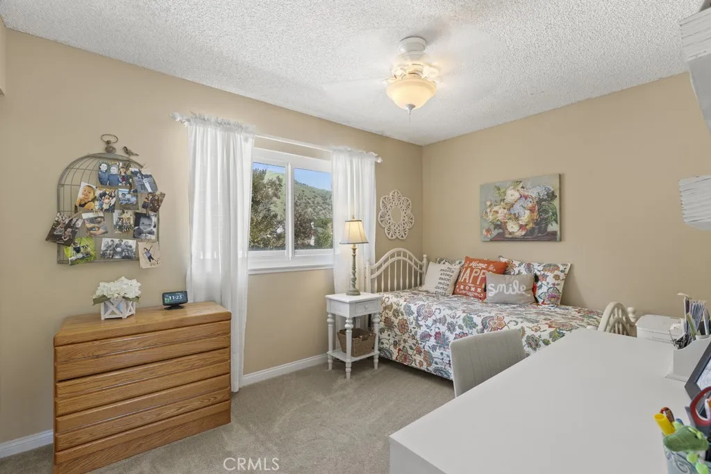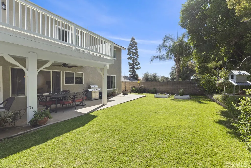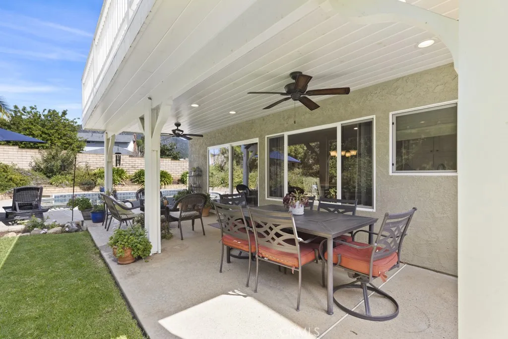 A thoughtfully updated downstairs bathroom enhances the home’s serene aesthetic. The family room offers a relaxed dining area, a cozy fireplace, a wet bar for entertaining, and tranquil views of the backyard. Step outside to your private retreat, complete with a PebbleTec pool and spa. The expansive covered patio—with recessed lighting and an overhead fan—extends your living space and sets the stage for outdoor dining and year-round enjoyment.