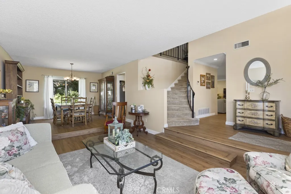 Nestled against the Foothills of North La Verne, this charming four-bedroom pool home sits on a sweeping corner lot along a street treasured for its privacy and neighborly spirit. A brick-lined front porch and classic curb appeal invite you inside, where warm wood flooring flows through the main level. The step-down living room and formal dining room create an elegant setting for gatherings, while the renovated kitchen blends white shaker cabinetry with warm granite tones for a timeless look.