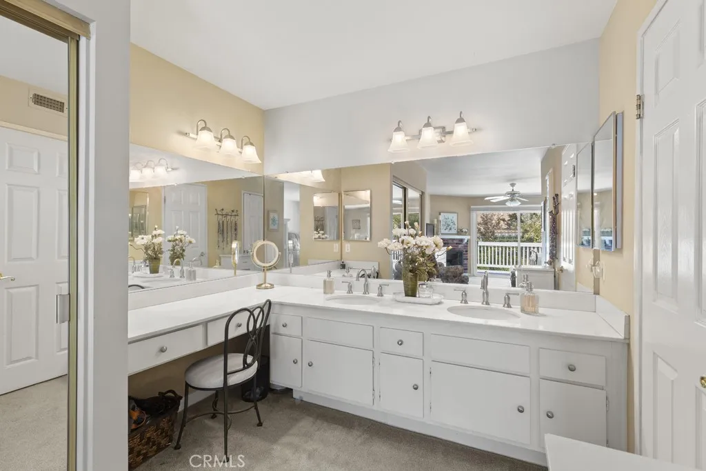 Upstairs, the primary suite feels like its own getaway, featuring a second fireplace, a private balcony overlooking the pool, and an ensuite with double sinks, a vanity/make-up area, two large closets, and a separate walk-in shower accented by travertine tile flooring. Three additional bedrooms offer flexibility for guests, hobbies, or a dedicated home office.