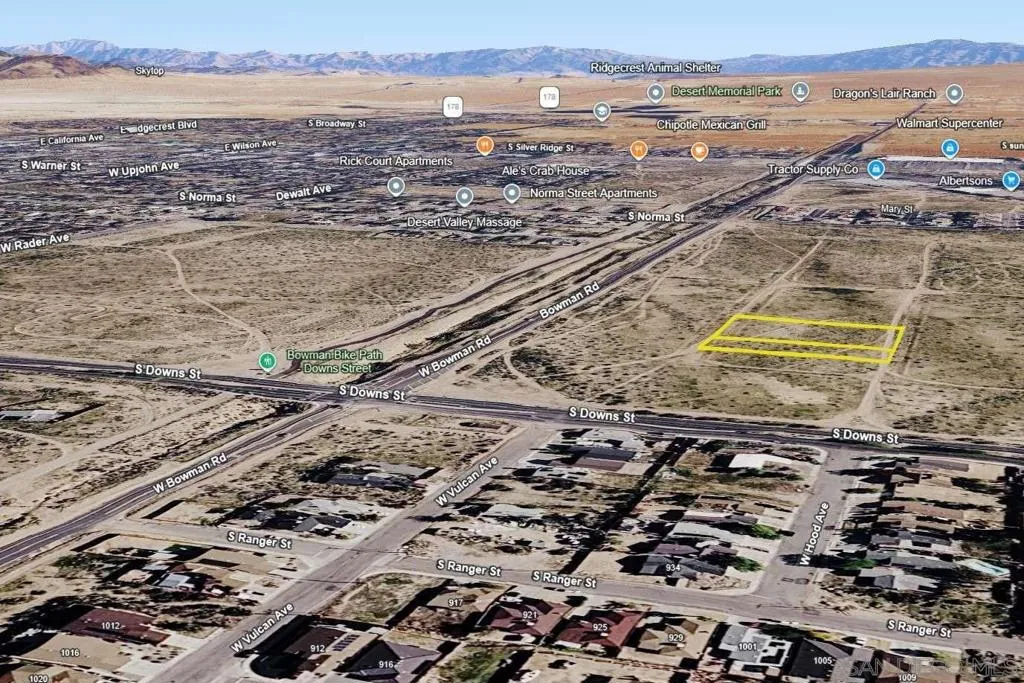 This 2.01-acre property in Ridgecrest, Kern County offers open land with power lines in the surrounding area! The lot features dirt road access and a spacious layout that provides flexibility for residential use or a future build. Plus, the wide views and open surroundings create a quiet setting while still being close to town. Located just minutes from central Ridgecrest, the property is near Walmart Supercenter Ridgecrest, Cerro Coso Community College, and the Naval Air Weapons Station China Lake. Daily shopping, restaurants, schools, and local services are a short drive away while still enjoying the open environment. This location combines accessible utilities, nearby city amenities, and spacious Kern County land!