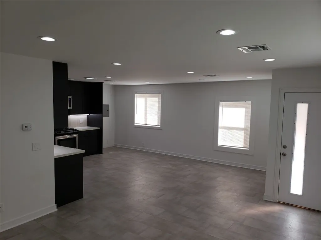 The front unit has been recently remodeled with a stunning modern kitchen featuring sleek dark flat-panel cabinetry, quartz countertops, designer glass tile backsplash, and all stainless steel appliances including gas range, microwave, and dishwasher. Bathrooms showcase elegant marble-look porcelain tile, glass-enclosed showers, and contemporary dark vanities with quartz tops. The remaining three units are also updated with granite counters, newer appliances, and refreshed bathrooms.