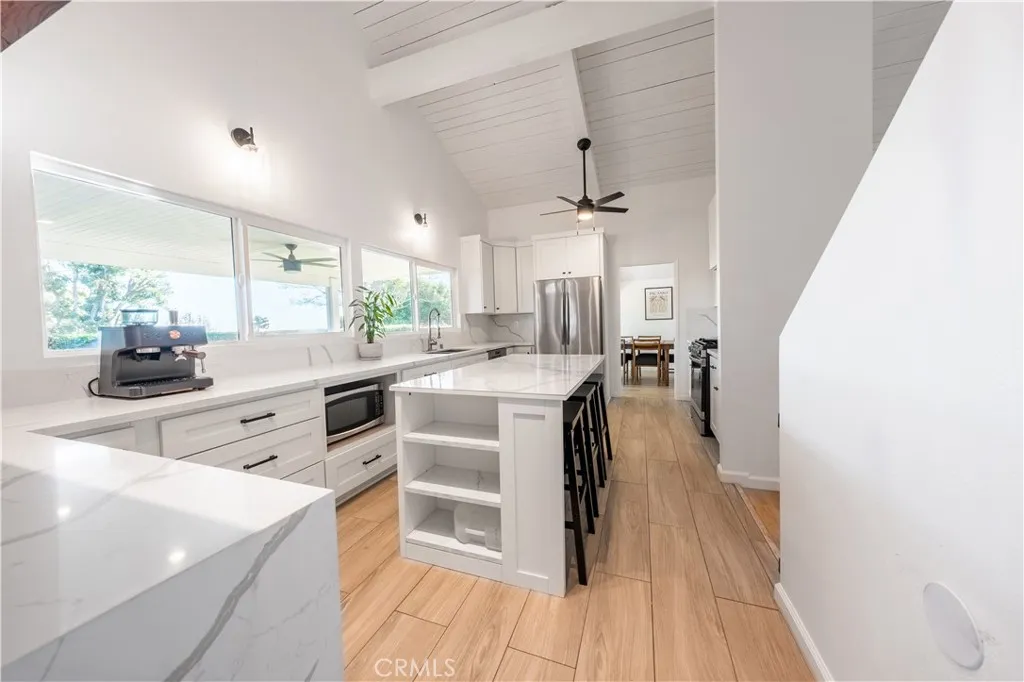 The remodeled kitchen is the heart of the home, complete with a large island and picturesque views toward Long Beach and the coastline. The kitchen flows seamlessly into the living spaces, making it ideal for everyday living or hosting friends and family.