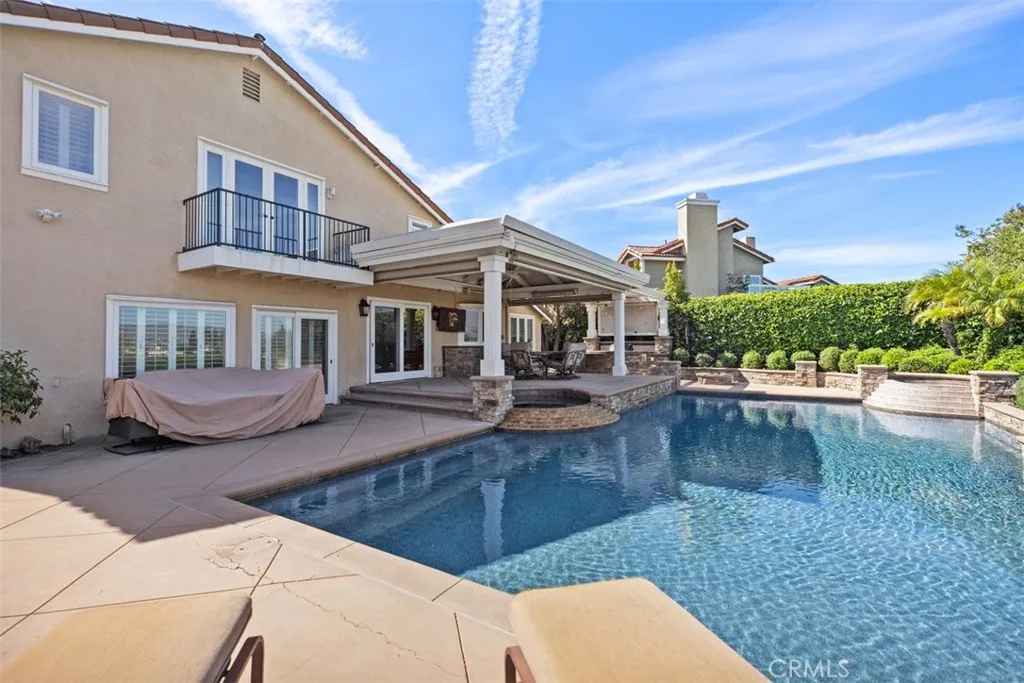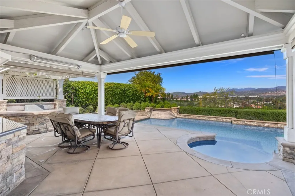 Unobstructed Panoramic Views set the stage for this Private Resort-style Pool home. Perched high in the hills of Madrid Del Lago, the residence captures sweeping Saddleback Mountain and city-light views. The thoughtfully modified floor plan offers 3 bedrooms and 3 baths, including a welcoming formal living room with fireplace and an expanded family room designed as the heart of the home. Designed for everyday living and entertaining, the family room showcases custom built-ins, a wet bar, integrated desk, and a second fireplace. The kitchen with breakfast bar opens effortlessly to the family room, keeping you connected to views and conversation. Upstairs, the primary suite features a private view balcony, cedar-lined walk-in closet, built-in dresser, dual sinks, and walk-in shower. Secondary bedrooms share a hall bath with jetted tub, while a convenient downstairs guest bath includes a walk-in shower. Detailed craftsmanship is evident throughout the home, which has also been completely re-piped. Outdoors, the private backyard extends the living experience with a sparkling saltwater pool and spa, barbecue island, and covered patio with TV, heaters, and roll-down shades – all framed by sweeping views from the home’s elevated vantage point. Enjoy community walking trails, lakeside dinning, and membership to Lake Mission Viejo with access to beaches, boating, concerts, and year-round community events. Low HOA, Low Tax Rate, No Mello-Roos.