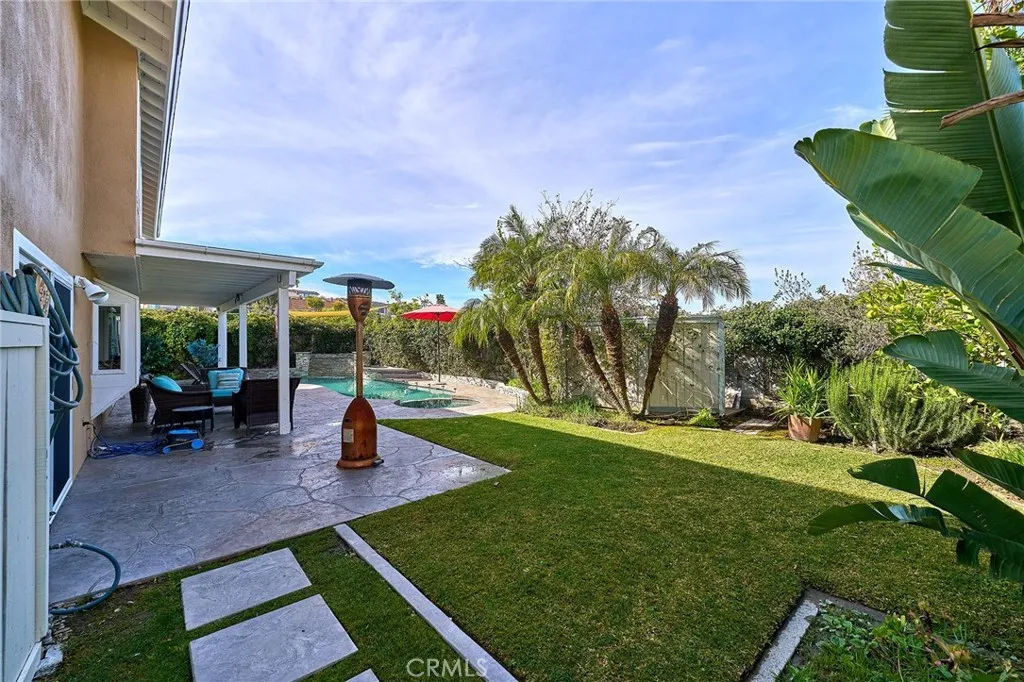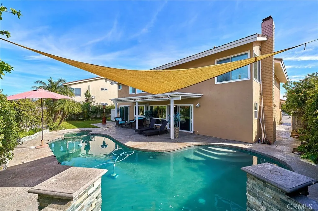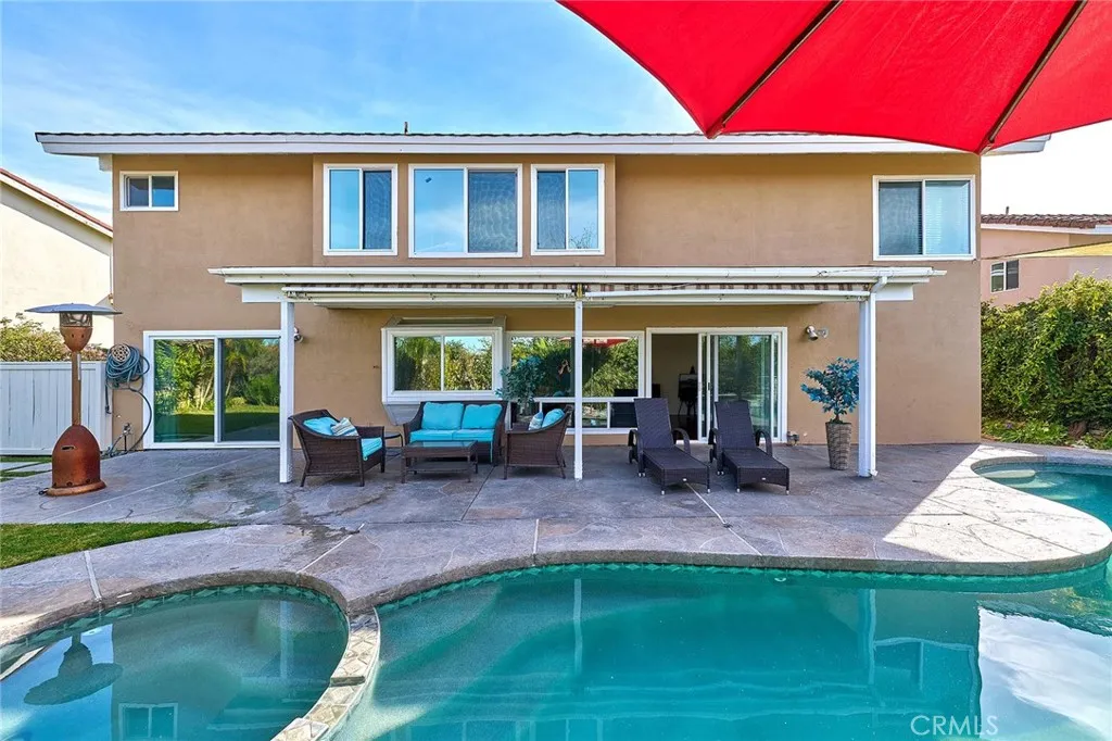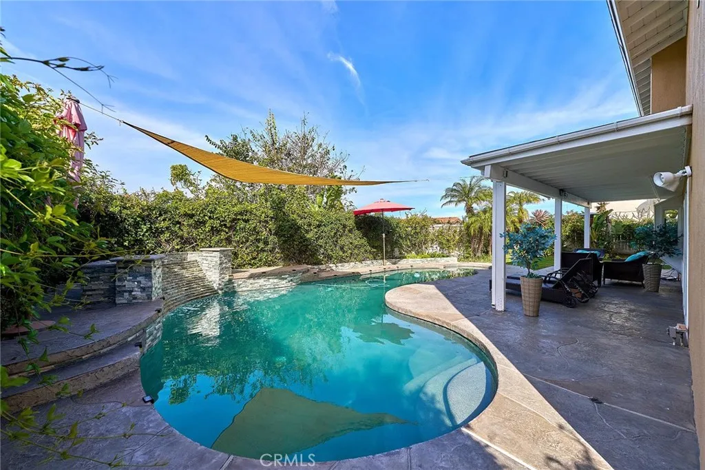 The backyard offers privacy and functionality, featuring a privacy fence, designer stamped concrete hardscaping, and a pool upgraded with a mini-pebble and ridge stone finish, accented by a cascading waterfall.