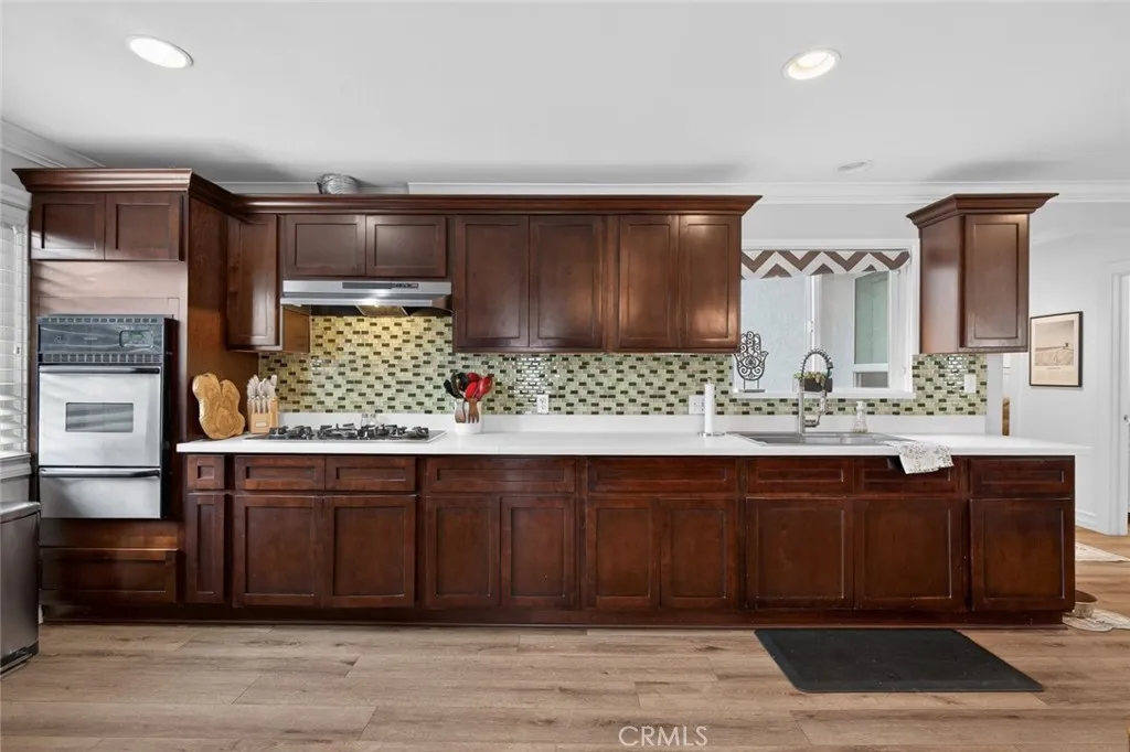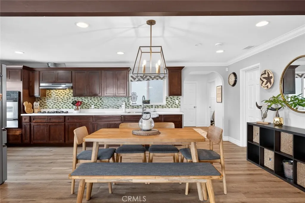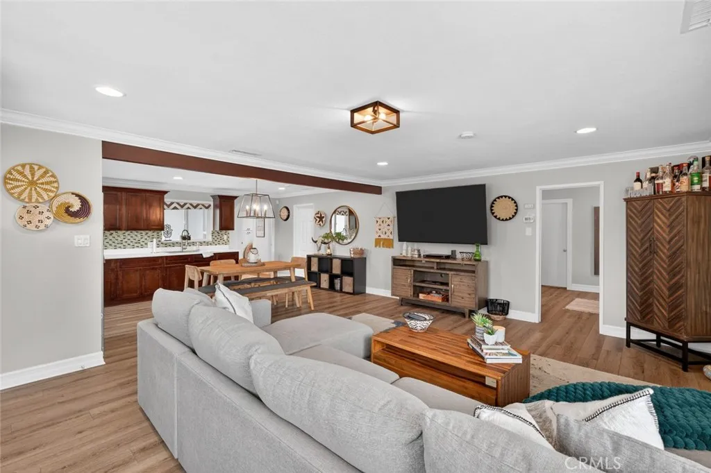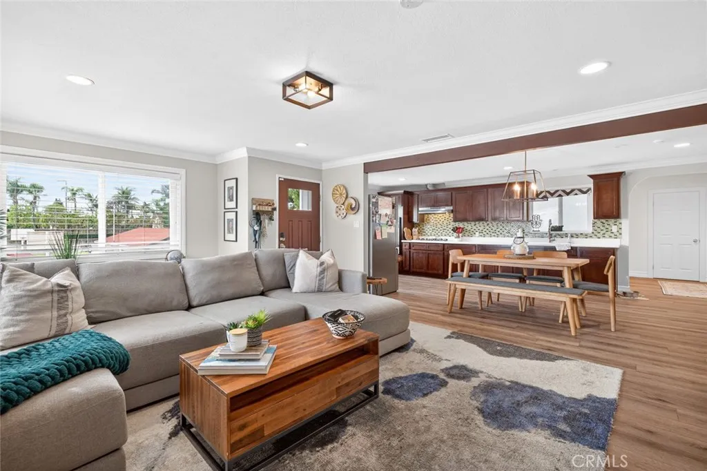 Inside, the open-concept floor plan seamlessly connects the living, dining, and kitchen areas, highlighted by abundant natural light, tile flooring, crown molding, and recessed lighting. The spacious kitchen offers generous cabinetry, ample counter space, mosaic tile backsplash, and a large front-facing window. The additional laundry room in the main house includes extensive storage.