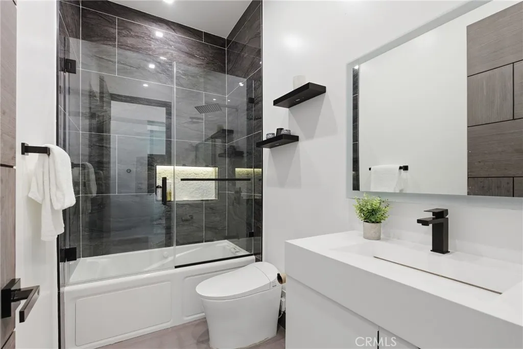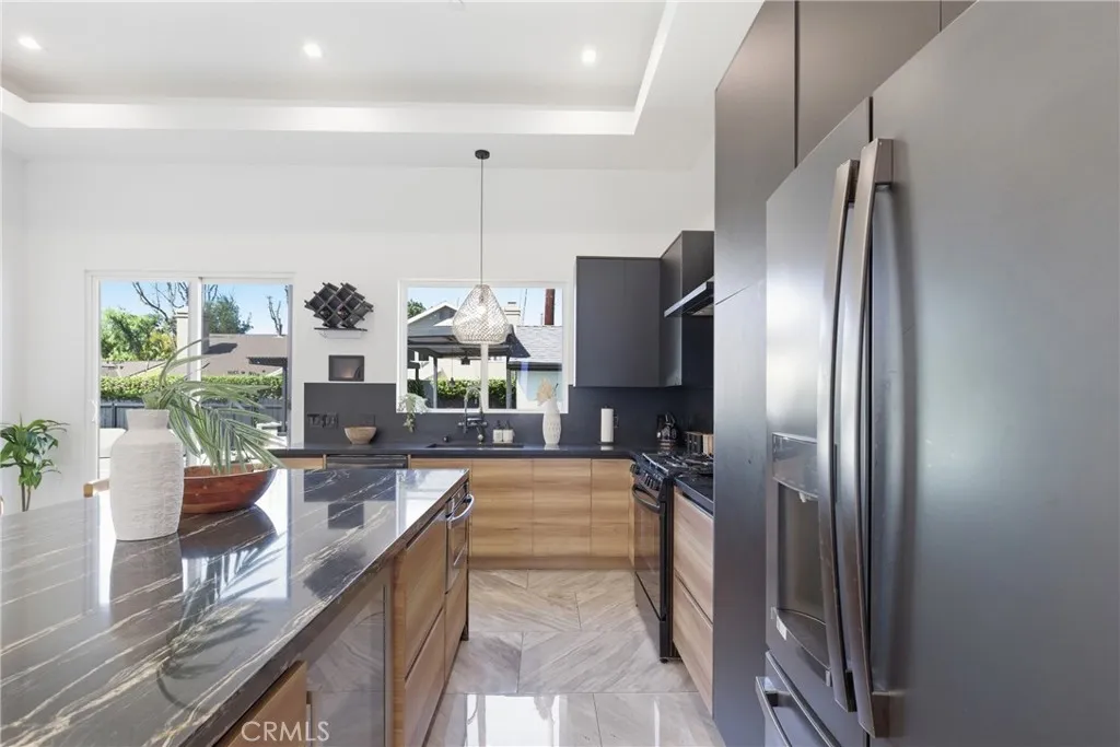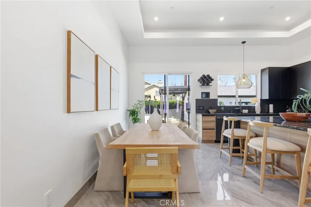 Inside, the spacious layout is filled with natural light and offers a seamless flow between the living room, dining area, and chef’s kitchen. The kitchen features custom cabinetry, quartz countertops, a large center island with breakfast bar, and high-end appliances, making it ideal for both daily living and hosting.