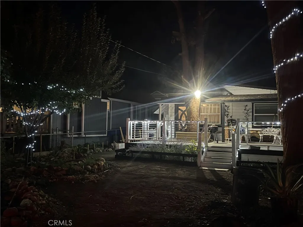 Exterior improvements include fresh white paint with black trim, low-voltage deck lighting, new deck railing with oak posts and stainless steel rods, and mature fruit trees including apple, plum, and fig.