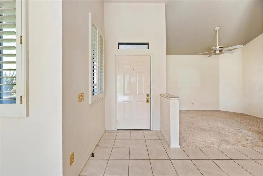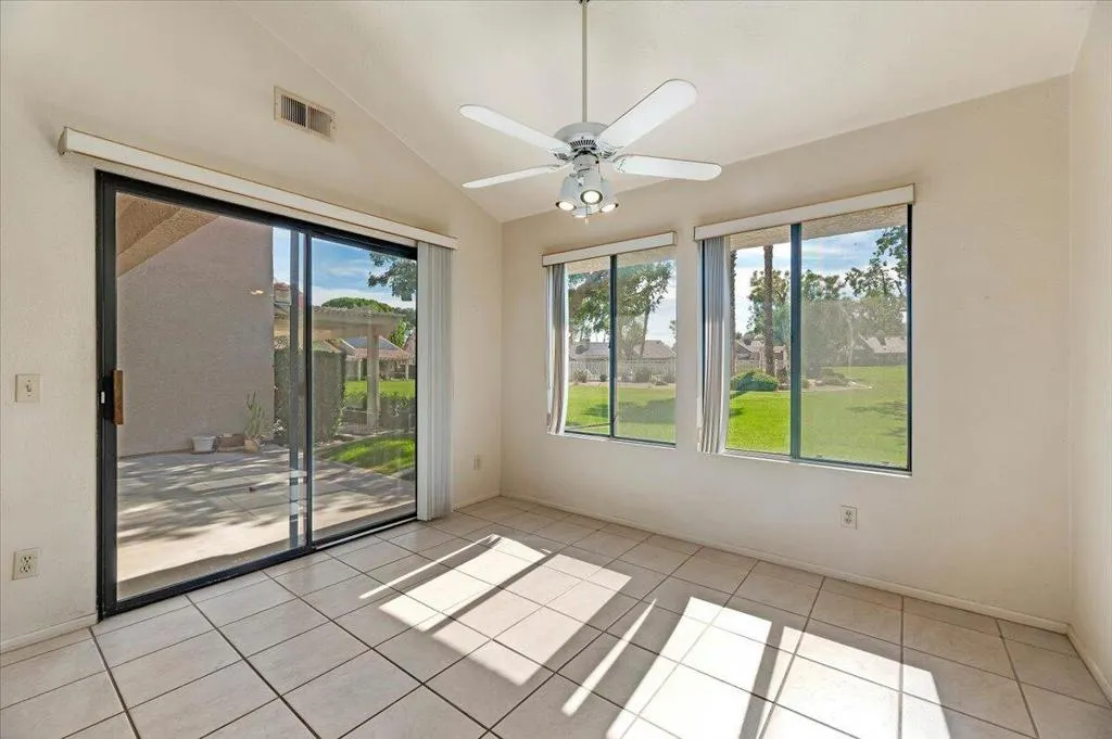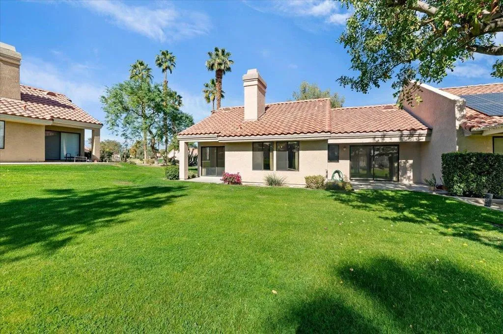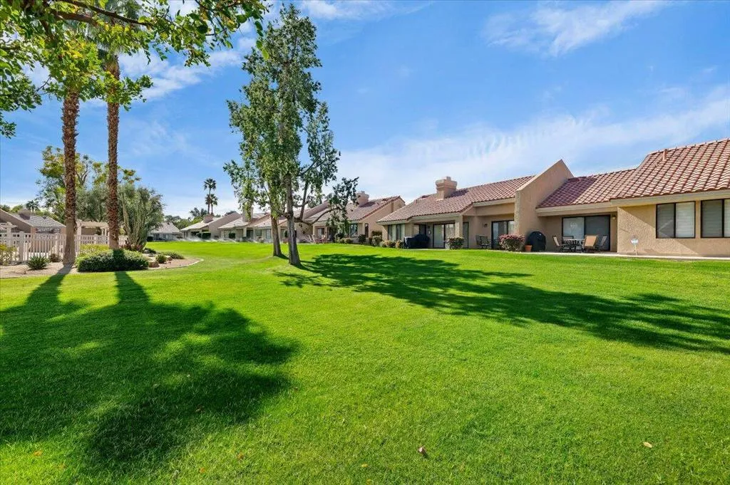 What if you could own a home in Palm Desert Resort Country Club with greenbelt views and a community pool just steps from your patio?This two-bedroom plus den home offers flexible living space perfect for guests, a home office, or a quiet retreat. The living room features vaulted ceilings, plantation shutters, and a fireplace that creates a warm and inviting atmosphere.The kitchen opens to an informal dining area designed for comfortable everyday living.Highlights include:Two-car garage Greenbelt location Community pool just steps away Short-term rentals allowed.Palm Desert Resort Country Club is a gated community featuring a lush 18-hole championship golf course, clubhouse, tennis courts, bocce ball, lakes, and beautifully maintained greenbelts throughout the community.Association dues include building and grounds maintenance, cable TV, clubhouse access, and trash service.
