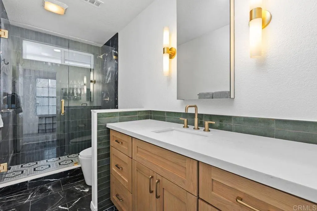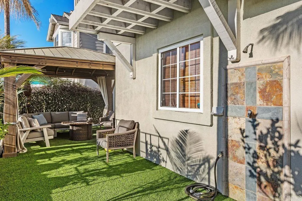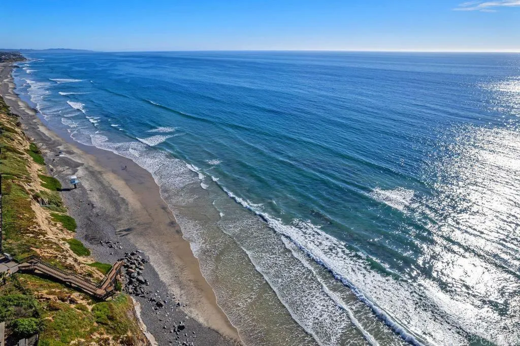 Rarely available oceanfront residence in the coveted Hanover Beach Colony, just steps from Carlsbad State Beach! This beautifully updated three-bedroom coastal home blends refined finishes with effortless beach living. The main level features all-new driftwood plank flooring designed for coastal durability, fresh interior paint, contemporary recessed lighting, and newly installed central A/C. Enjoy the intimate living room with fireplace and adjacent dining room. The redesigned powder room catches the coastal feel with blue floating vanity and marble countertop. The new kitchen showcases custom shaker cabinetry, Brazilian polished soapstone countertops, marble tile backsplash, and under-cabinet lighting. Premium appliances include a double oven with steam, convection and microwave options, five-burner cooktop with cast-iron griddle, and double refrigerator drawers under the coffee bar. A walnut-veneer island with built-in storage and seating for five anchors the space, ideal for everyday living and entertaining. Seamless indoor-outdoor flow leads to the ocean-view patio and professionally landscaped backyard featuring new easy-drain turf, a plumbed BBQ island and fire pit, gazebo with generous seating, solar lighting, and outdoor shower. Upstairs, the primary suite offers a tranquil retreat with a fully renovated spa-inspired bath including a soaking tub, oversized walk-in shower, custom dual vanity, and curated porcelain, slate, Italian tile, and quartz finishes. The secondary bath has also been completely remodeled with a custom French oak vanity, marble flooring, quartz counters, and walk-in shower. Additional highlights include built-in hall storage, an updated laundry room with quartz workspace, and a garage with floor-to-ceiling storage cabinetry. This thoughtfully designed turnkey home is being sold fully furnished! Residents of Hanover Beach Colony enjoy a community pool, volleyball court, parks, and picnic areas, all moments from Ponto Beach, shopping, dining, and the North County Transit District COASTER, offering the ultimate Southern California coastal lifestyle.