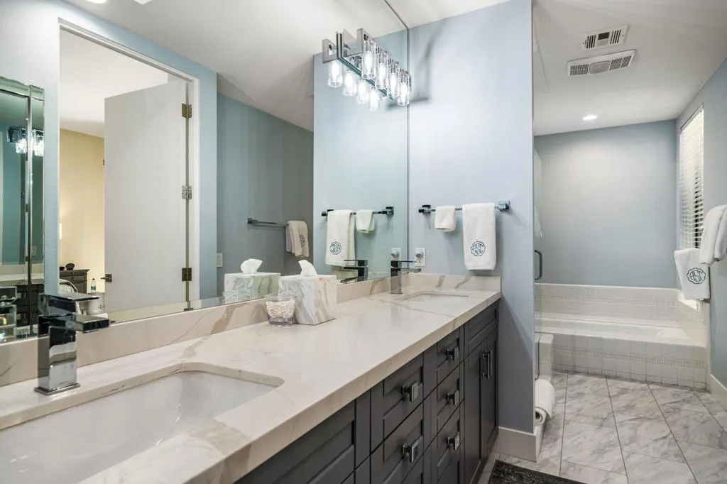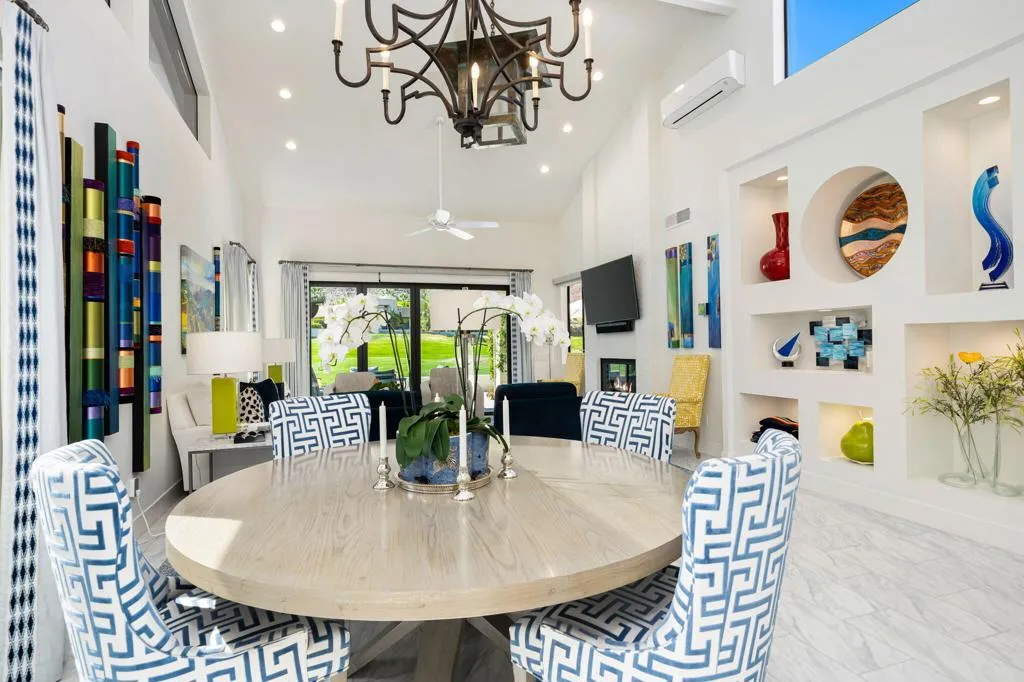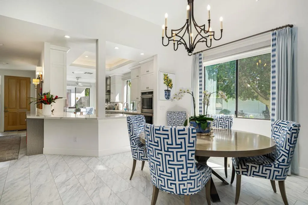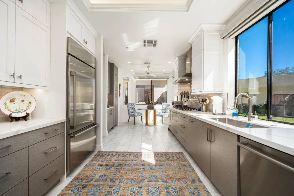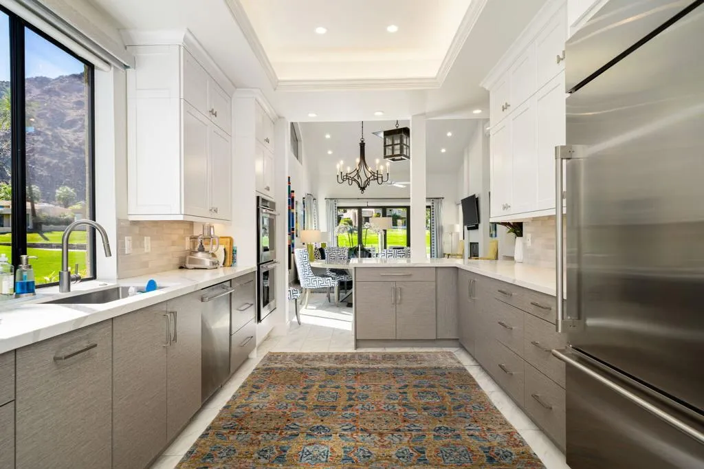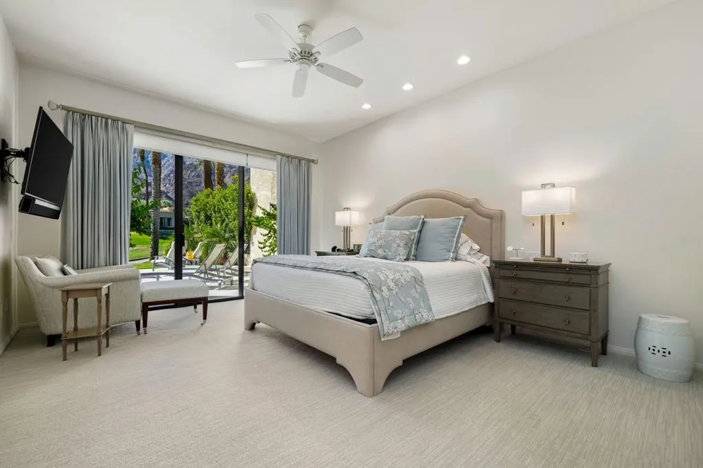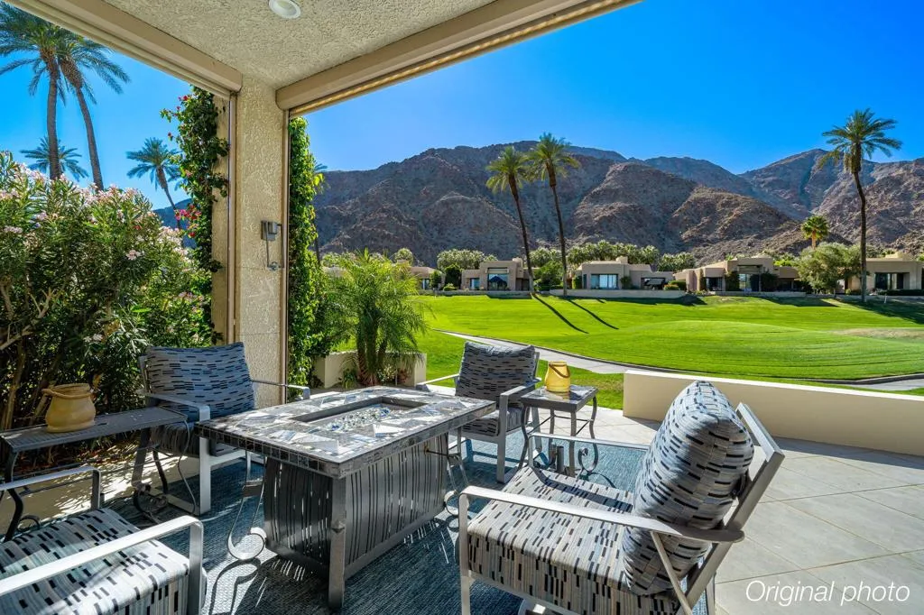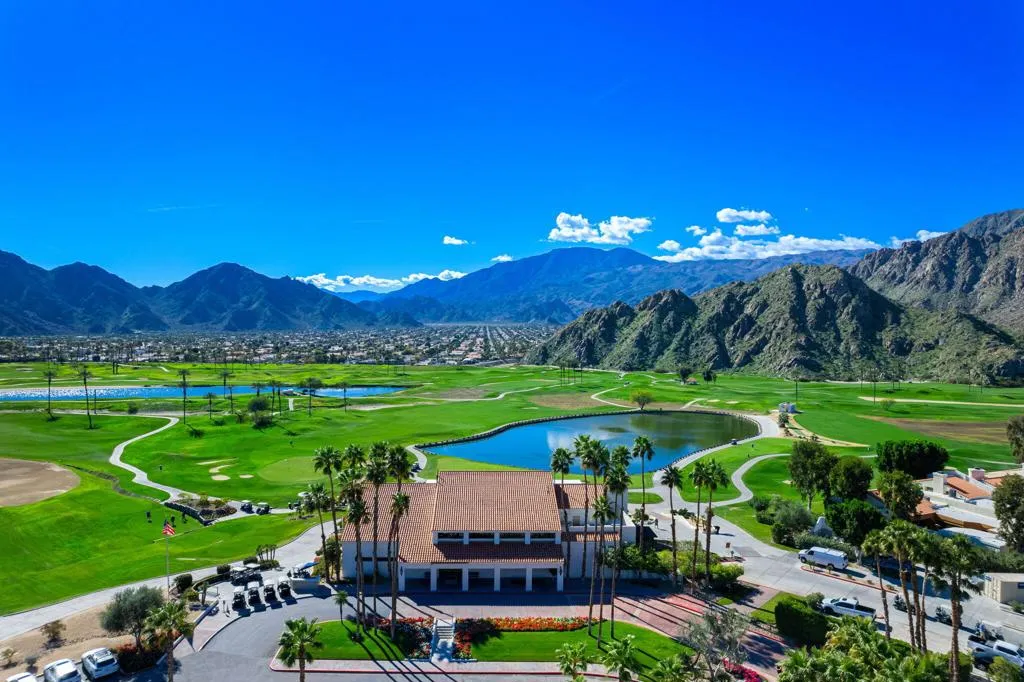 Breathtaking! Featuring a stunning panoramic view of the Santa Rosa Mountains and the rolling contours of the 11th fairway of the Mountain Course, this idyllic location is a vacation for the eyes!Remodeled in a sophisticated contemporary styling, this coveted Seville plan was built after the other homes, and incorporates unique design changes such as added space in the two primary suites, walk-in closets in all bedrooms, and skylights in several locations. The sleek new kitchen offers an open design, with marbled quartz countertops, double ovens, a 6-burner gas cooktop, and an oversized serving island adjoining the dining area. Views? Absolutely – the chef will be overjoyed at the mountain and greenspace vistas! Thoughtful touches abound in this beautiful home, including built-in storage in the foyer and bar, a customized display wall featuring sculptural niches for your favorite artworks, and motorized shades in the kitchen and great room. Dual-paned, stack-back doors form a wall of glass which expands your living space to include the rear patio, with its ceramic tiles, pony wall, built-in BBQ, and motorized shades. The private front courtyard, accessed through a designer glass door, soothes your guests with a trickling fountain, and sets the tone for the serenity within. The spacious dual primary suites easily accommodate two queen beds each, and both feature walls of sliders to bring the outside in. This one-of-a-kind home is designed to be the perfect desert dream – come claim it as your own!