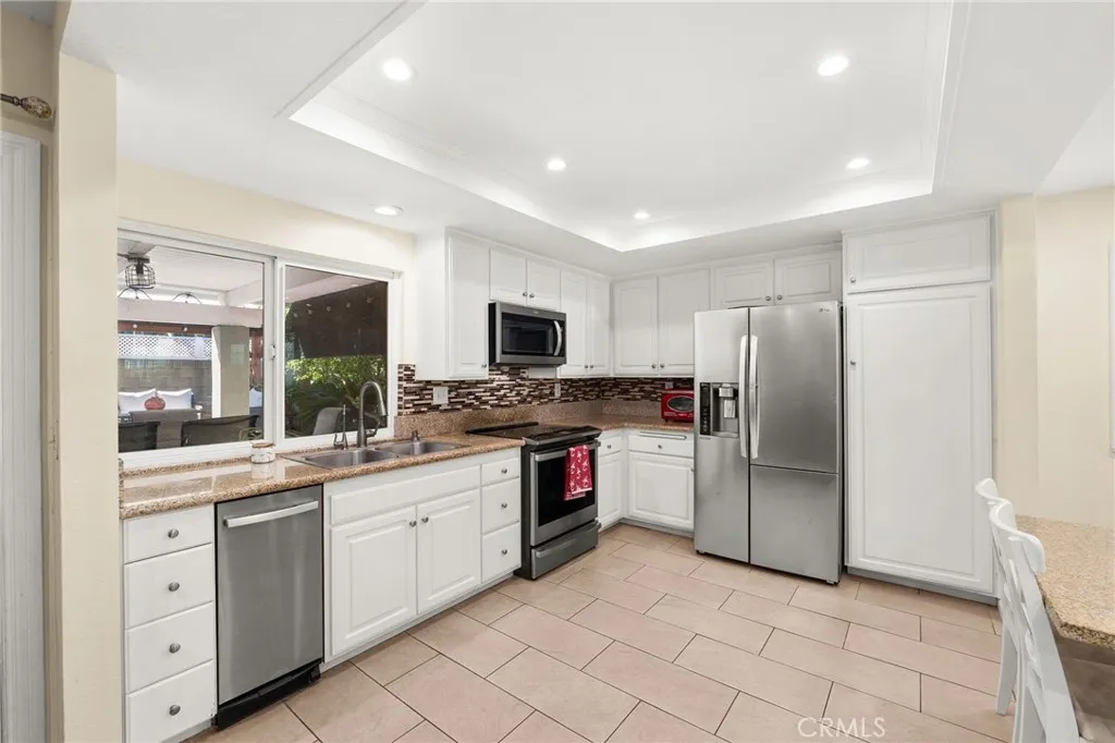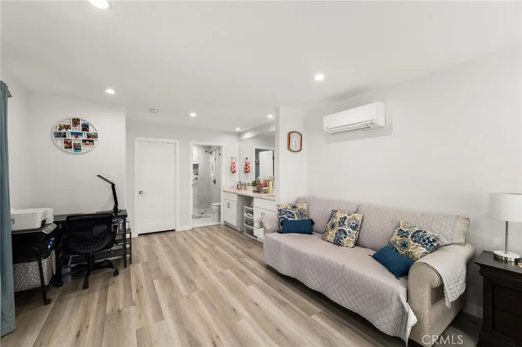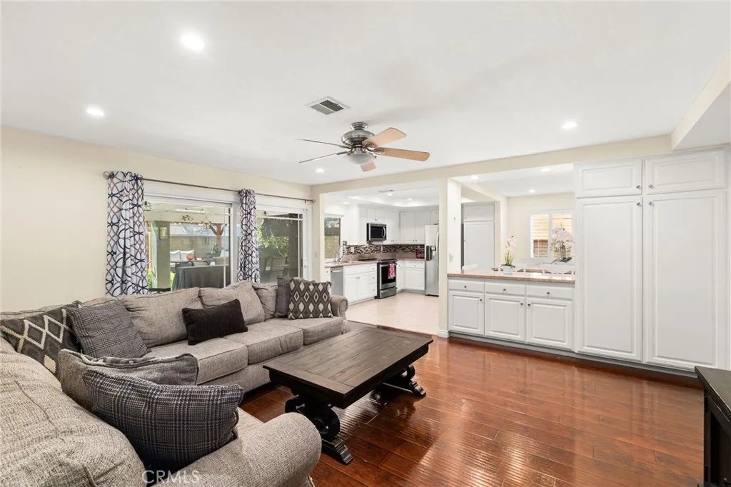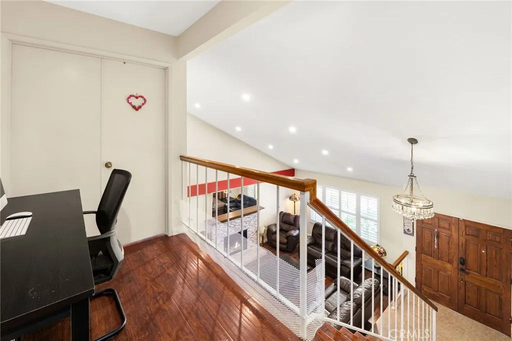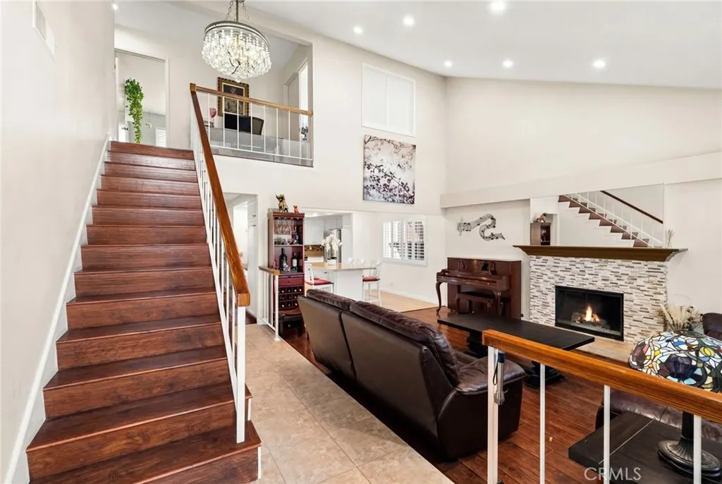 Beautifully upgraded home located in one of La Palma’s most desirable locations. This thoughtfully improved property features a permitted downstairs addition (over $100,000 investment) with its own private entrance and brand new bathroom with dual sinks, a brand-new walk-in shower and a new walk in closet. The space is ideal for multigenerational living, guest quarters, or—with minor modifications—can function as a Junior ADU for potential rental income. The home showcases a fully remodeled kitchen designed for both style and functionality, featuring granite countertops, custom backsplash, sturdy white cabinetry, recessed lighting, an oversized center island, and a new stove. The kitchen flows seamlessly into the family room and living room with vaulted ceilings, creating a bright and open living space enhanced by custom cabinetry that matches the kitchen design. Upstairs, the primary suite enjoys views of the nearby greenbelt and playground, while two additional bedrooms are spacious and well-appointed with a jack and jill bathroom. Additional upgrades include newer dual-pane insulated windows, custom wood shutters and durable laminate wood flooring. The backyard is designed for entertaining, featuring an oversized custom patio and two separate covered patio areas, perfect for gatherings and outdoor relaxation. The garage includes EV charging capability, adding modern convenience.