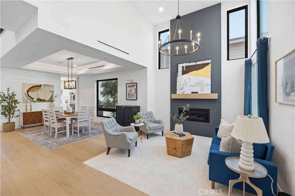 The open-concept main level is filled with natural light and anchored by a designer fireplace, flowing into a chef’s kitchen with quartzite countertops, oversized island, Sub-Zero built-in refrigerator, Bosch appliances, soft-close cabinetry, and hidden appliance garages for a sleek, clutter-free design.