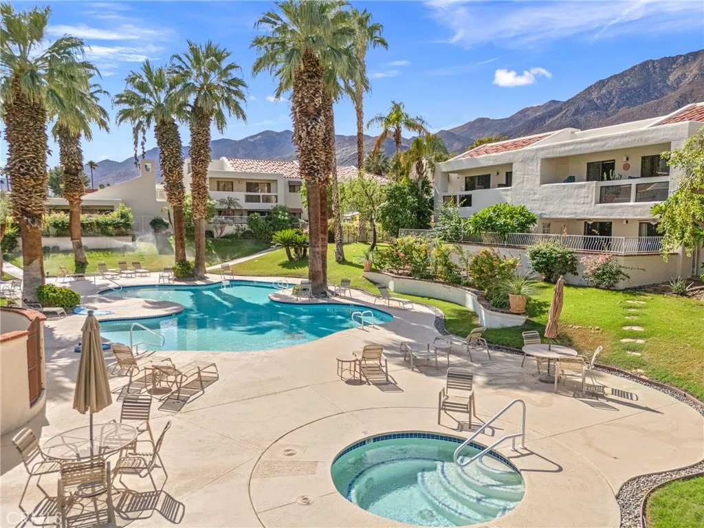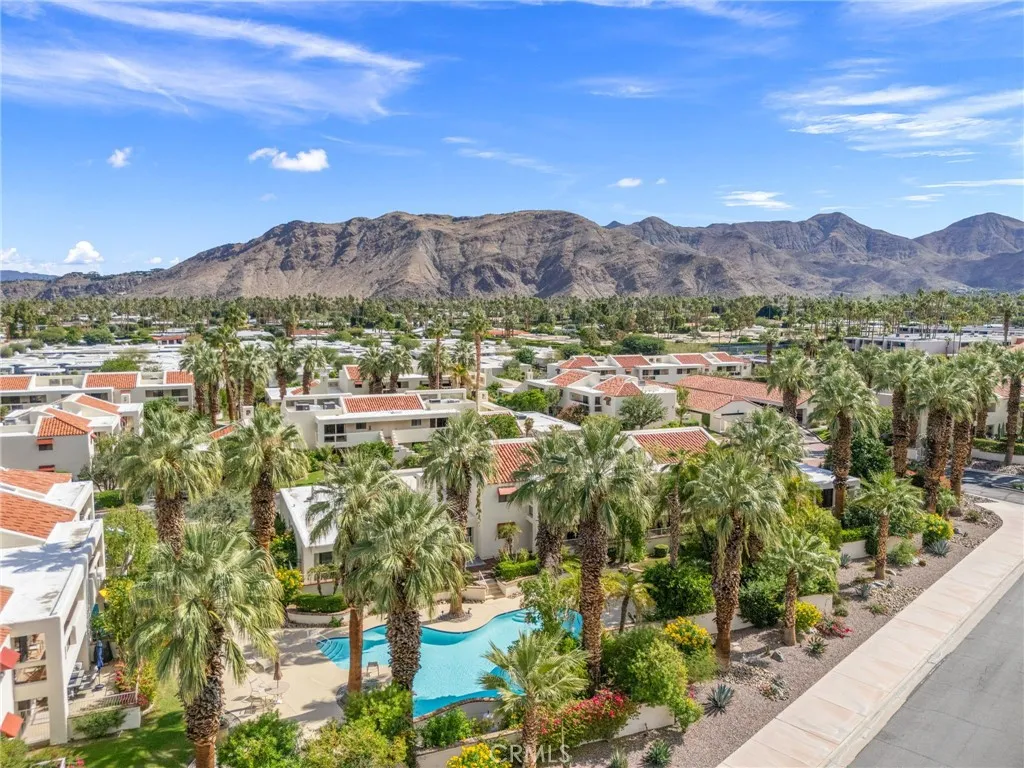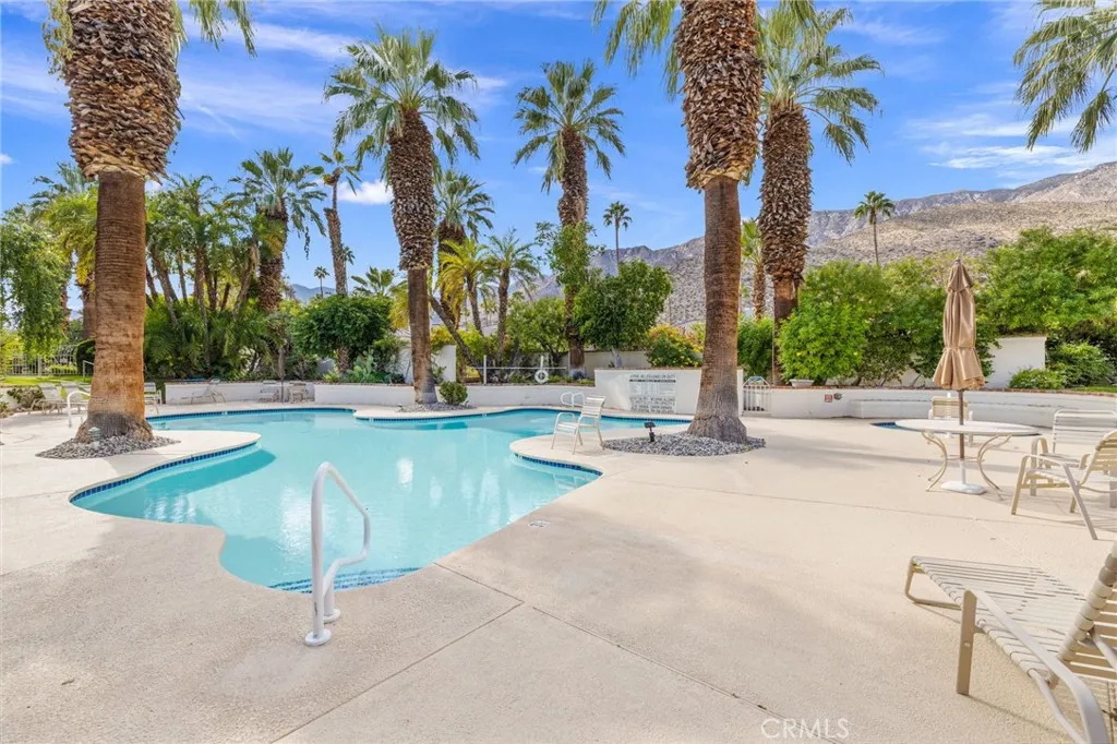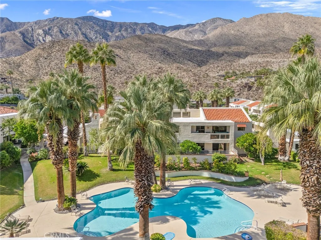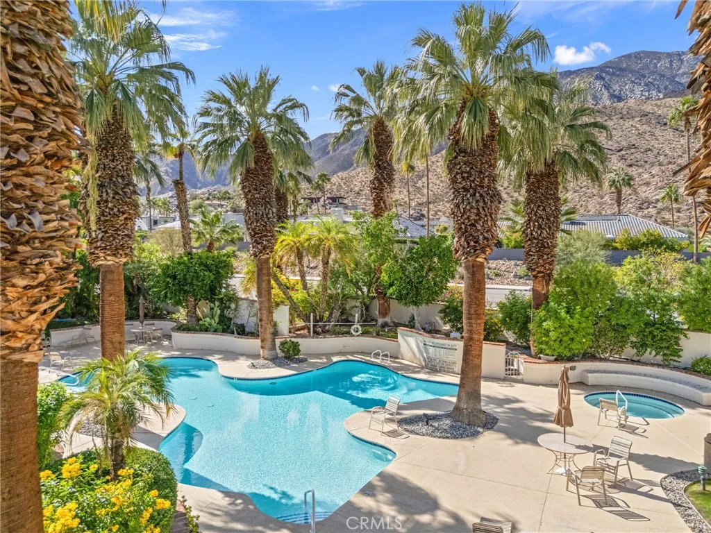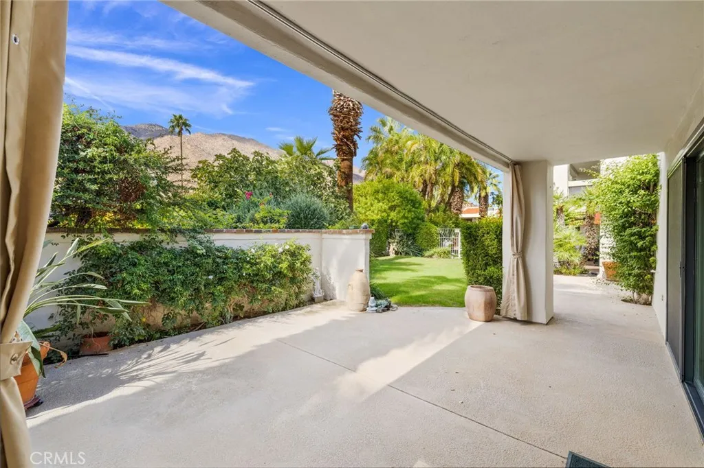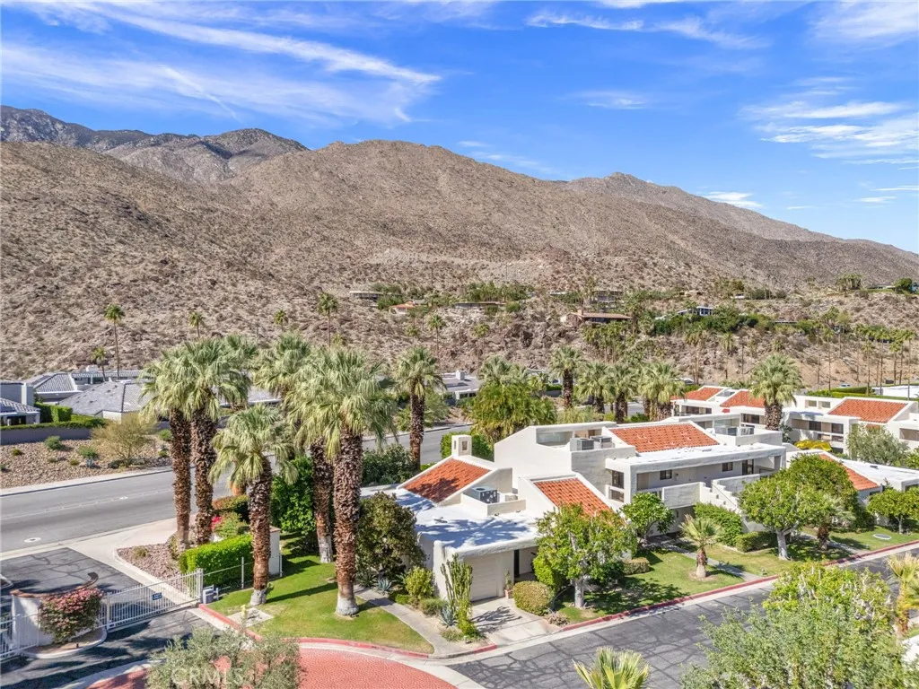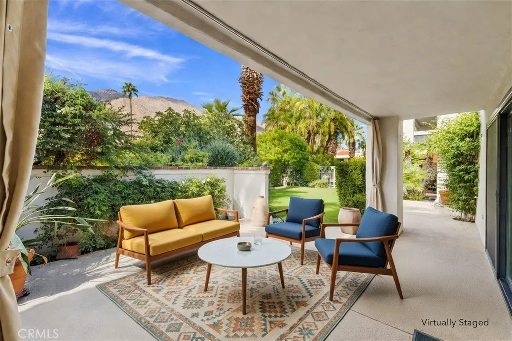 Discover this exceptional mid-century modern condo that offers the privacy and spacious feel of a single-family home. Situated in a gated community, this charming West-facing, end-unit, single-story home features brand new luxury vinyl floors, fresh paint throughout, and numerous upgrades including shutters, fridge, microwave, washer, dryer, and a brand-new water heater. In addition, there is NO LAND LEASE! providing long term value! The spacious living and dining areas feature stunning vaulted tongue-and-groove wood ceilings and a beautiful split marble fireplace, creating a light and airy ambiance complemented by breathtaking views of the San Jacinto Mountains. Step outside to the custom built front lanai; perfect for morning coffee surrounded by mature landscaped grounds. This home also offers custom shelving in the closets and garage, providing smart storage solutions. The back patio shares a yard with the community and has access to one of the pools. Resort-style amenities include two, tennis courts (one striped for pickleball!), pools and spas. Only one of several units to offer a convenient, attached one-car garage with direct access. Walk to downtown Palm Springs and enjoy the varied museums, unique shops, and incredible restaurants. Experience the perfect blend of classic mid-century design and elevated modern comfort in this beautifully maintained home. Don’t miss out on this chance to make it yours!