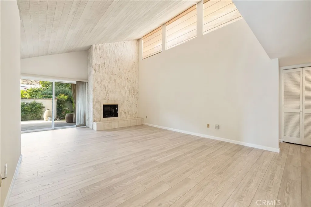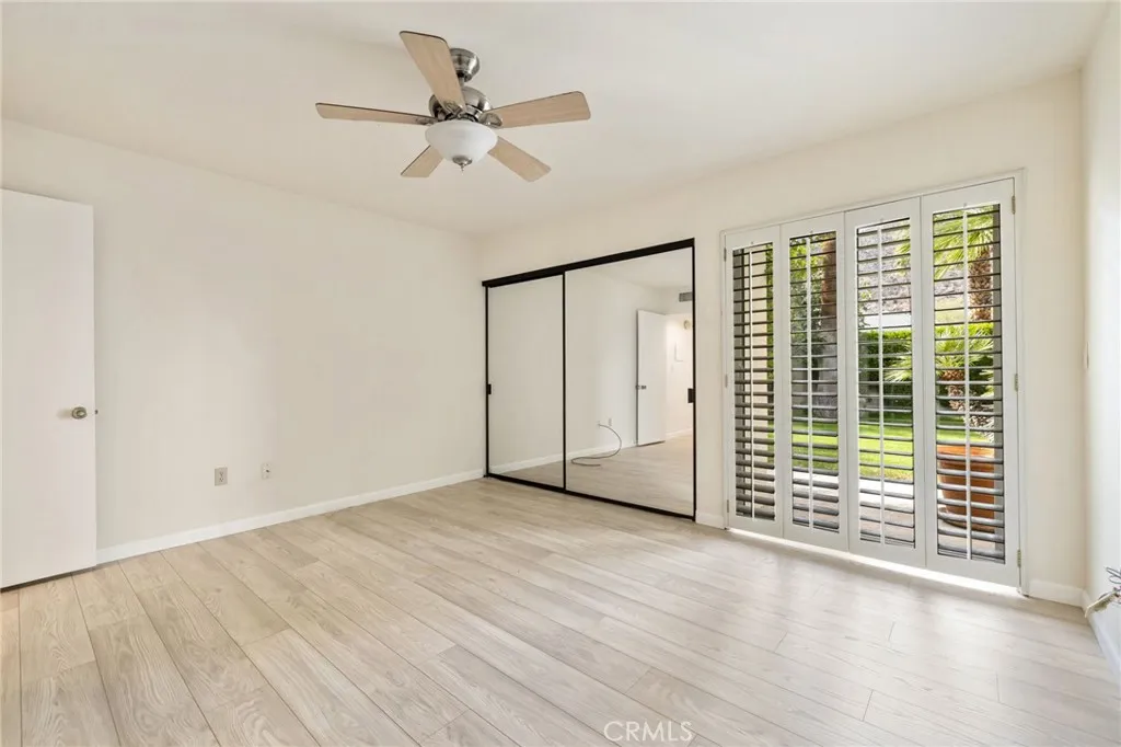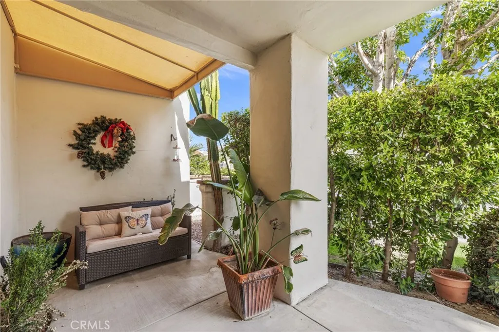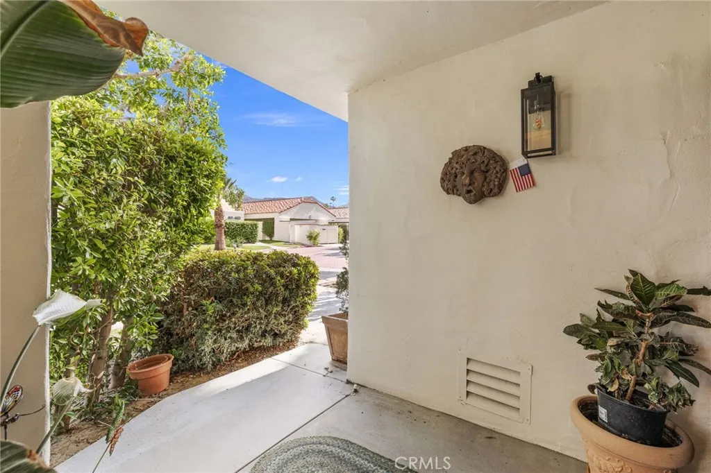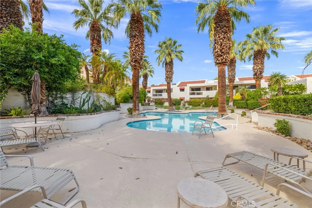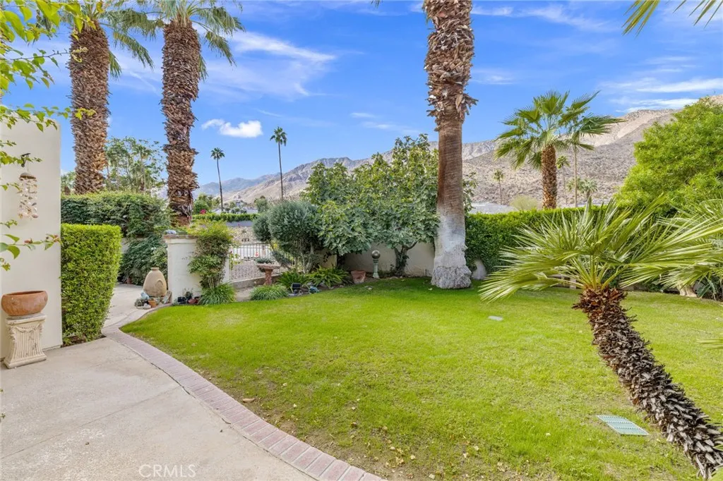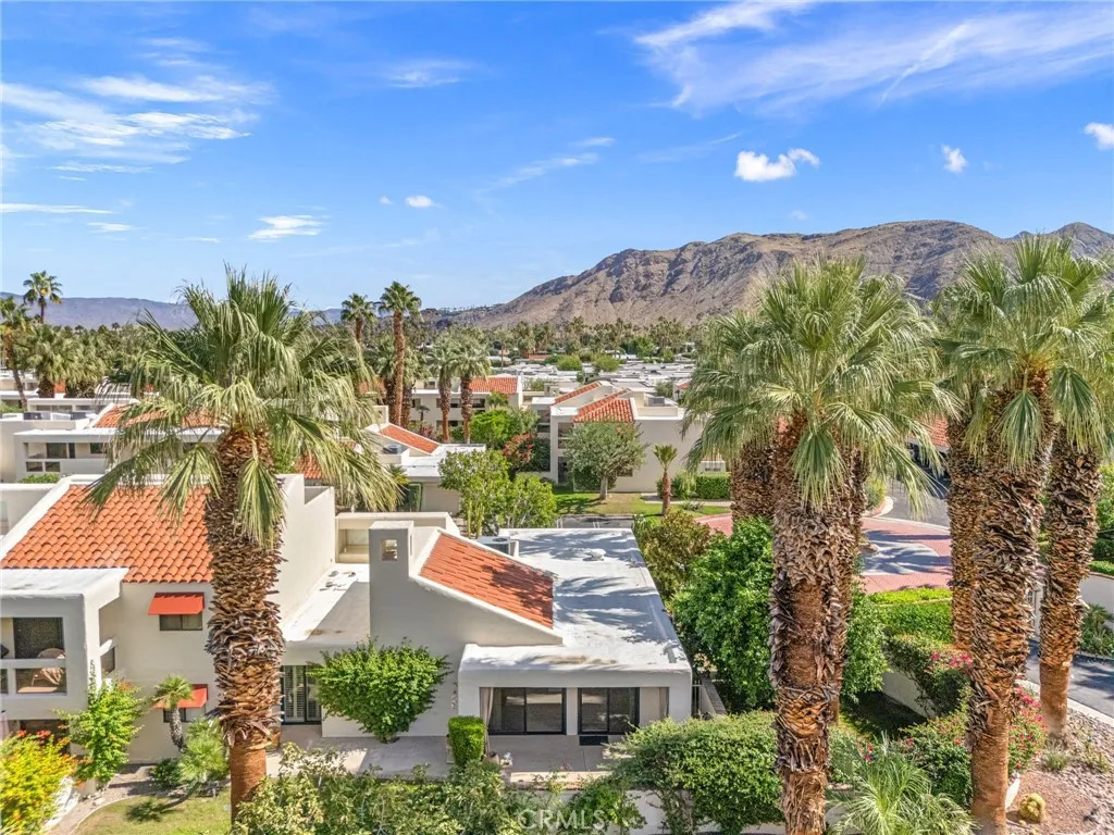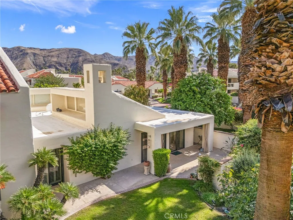 Discover this exceptional mid-century modern condo that offers the privacy and spacious feel of a single-family home. Situated in a gated community, this charming West-facing, end-unit, single-story home features brand new luxury vinyl floors, fresh paint throughout, and numerous upgrades including shutters, fridge, microwave, washer, dryer, and a brand-new water heater. In addition, there is NO LAND LEASE! providing long term value! The spacious living and dining areas feature stunning vaulted tongue-and-groove wood ceilings and a beautiful split marble fireplace, creating a light and airy ambiance complemented by breathtaking views of the San Jacinto Mountains. Step outside to the custom built front lanai; perfect for morning coffee surrounded by mature landscaped grounds. This home also offers custom shelving in the closets and garage, providing smart storage solutions. The back patio shares a yard with the community and has access to one of the pools. Resort-style amenities include two, tennis courts (one striped for pickleball!), pools and spas. Only one of several units to offer a convenient, attached one-car garage with direct access. Walk to downtown Palm Springs and enjoy the varied museums, unique shops, and incredible restaurants. Experience the perfect blend of classic mid-century design and elevated modern comfort in this beautifully maintained home. Don’t miss out on this chance to make it yours!