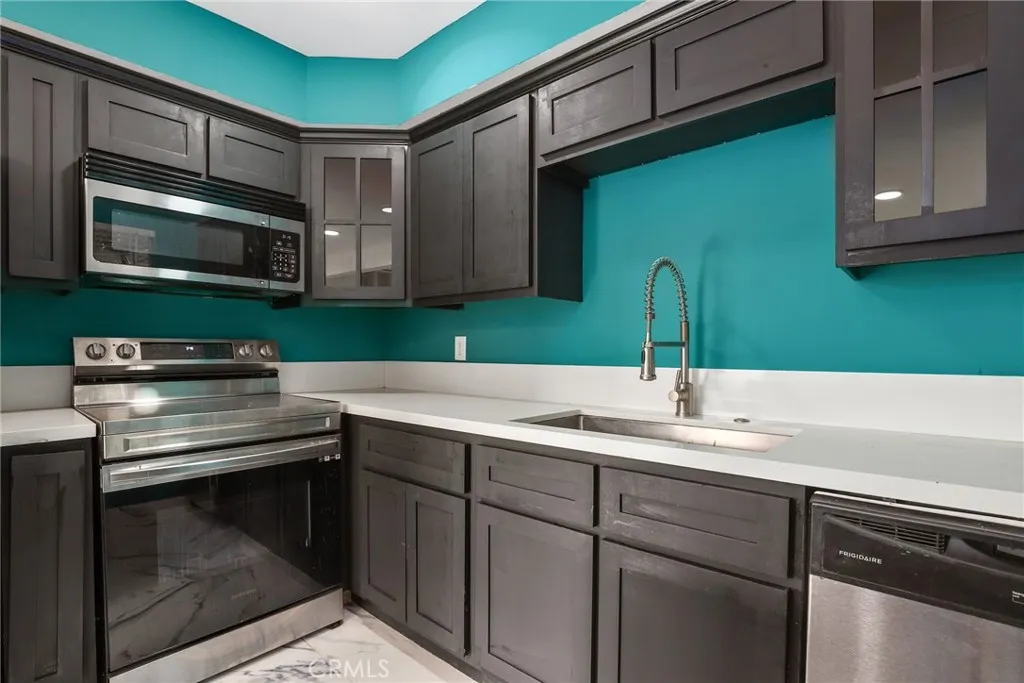 Welcome to The Rose Bud, a charming 36-unit complex with lush landscaping, a gated entry, and a sparkling swimming pool! This 2 BR/1 BA condo has been remodeled to a chic, modern aesthetic with Brazilian porcelain tile flooring throughout and an open-concept living, dining, and kitchen. The kitchen has elegant dark cabinetry; stainless steel appliances, an appealing “waterfall-style” white stone breakfast bar; and stone countertops. Each well-sized bedroom has direct access to the private, covered balcony. The impressive bathroom has a large step-in, tile, and glass shower. This end unit has only one adjoining wall, central AC and heating, and a tandem, 2-car parking space. The HOA includes access to the pool and BBQ area, nearby community laundry, water/sewer/trash, common area maintenance, controlled access entry with video surveillance, gated parking, and exterior insurance. This unit is mere steps from the pool, community laundry, and parking!) Walkable to Ventura Blvd, Nordstrom Rack and Trader Joes.