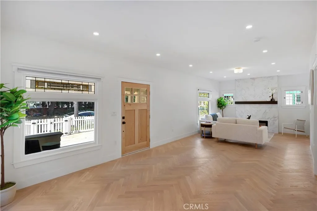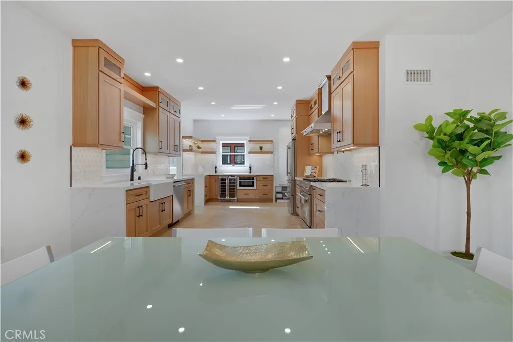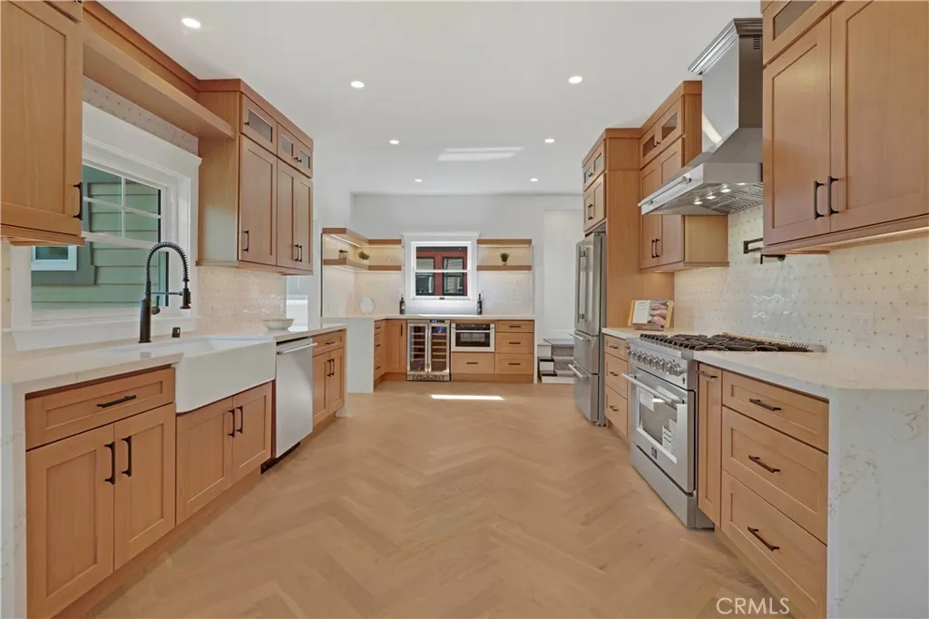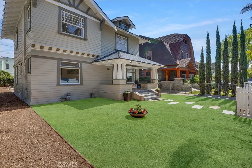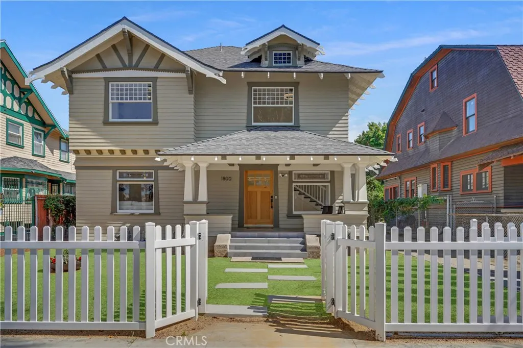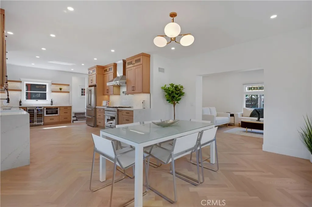 Rebuilt from the original redwood framing, this home underwent a comprehensive down-to-the-studs renovation, with all prior plaster, electrical, walls, and flooring fully removed and replaced with modern systems and finishes. This stunning residence in the highly sought-after Harvard Heights Historic District blends timeless charm with modern luxury living. All renovations were completed with permits, offering peace of mind in craftsmanship and safety. Step into a bright, open-concept layout with a thoughtfully designed floor plan that connects each space effortlessly—ideal for everyday living and entertaining. The living room transitions seamlessly into an expansive dining area, creating a natural flow for gatherings. A stylish wine and cocktail bar with a built-in wine fridge enhances the entertaining experience. At the heart of the home is a true culinary oasis, designed with an efficient work triangle for any gourmet chef. The kitchen features Redondo Oak shaker cabinetry, Carrera-style quartz waterfall countertops, and a Nova Dolomite Brass Polished Marble Mosaic backsplash, delivering a refined, timeless aesthetic. Premium name-brand appliances are included. Major upgrades include all-new copper plumbing, a new sewer line, and a complete electrical overhaul with Brand New Upgraded panel. Dimmer-controlled lighting is installed in every bedroom. Comfort is elevated with a dual-zone HVAC system with two independent units for optimal climate control (Unit on each level). Interior finishes include new drywall, designer paint, recessed lighting, modern fixtures, and new hardwood flooring from the Spectacular Herringbone Collection in Glacier Stone. Exterior upgrades include a new 25-year shingle roof with Cool Roof technology and low-maintenance landscaping with stabilized decomposed granite. The backyard is perfect for entertaining, complete with luxury furnishings by Janus et Cie. The property offers parking for 5–6 vehicles in the driveway and garage, with additional space to accommodate 20+ cars. The detached garage presents excellent ADU conversion potential for added income. Prime central location just minutes from Downtown LA, LA Live, Crypto.com Arena, Culver City, Loyola High School, USC, UCLA, Beverly Hills, Hollywood and Sunset Blvd. A rare opportunity to own a fully modernized luxury home in one of Los Angeles’ most historic and desirable neighborhoods.