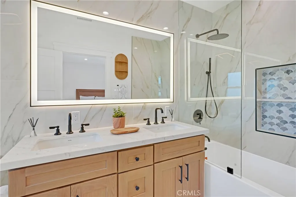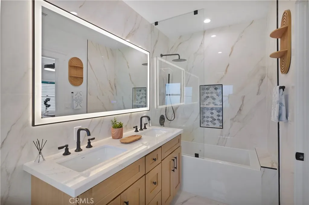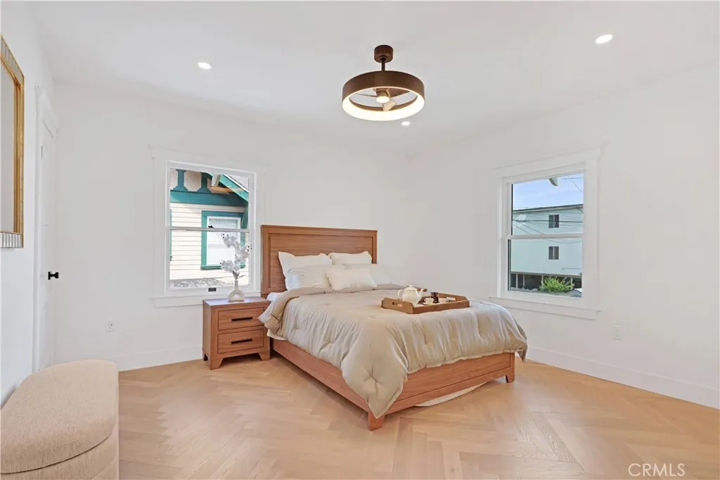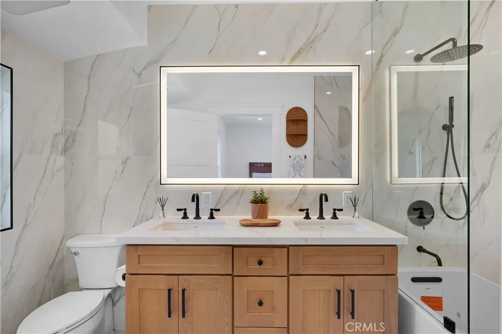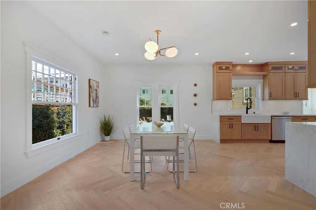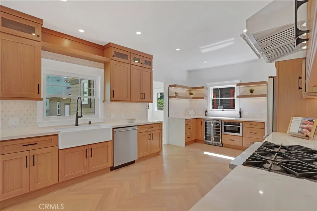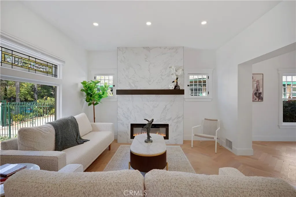 Rebuilt from the original redwood framing, this home underwent a comprehensive down-to-the-studs renovation, with all prior plaster, electrical, walls, and flooring fully removed and replaced with modern systems and finishes. This stunning residence in the highly sought-after Harvard Heights Historic District blends timeless charm with modern luxury living. All renovations were completed with permits, offering peace of mind in craftsmanship and safety. Step into a bright, open-concept layout with a thoughtfully designed floor plan that connects each space effortlessly—ideal for everyday living and entertaining. The living room transitions seamlessly into an expansive dining area, creating a natural flow for gatherings. A stylish wine and cocktail bar with a built-in wine fridge enhances the entertaining experience. At the heart of the home is a true culinary oasis, designed with an efficient work triangle for any gourmet chef. The kitchen features Redondo Oak shaker cabinetry, Carrera-style quartz waterfall countertops, and a Nova Dolomite Brass Polished Marble Mosaic backsplash, delivering a refined, timeless aesthetic. Premium name-brand appliances are included. Major upgrades include all-new copper plumbing, a new sewer line, and a complete electrical overhaul with Brand New Upgraded panel. Dimmer-controlled lighting is installed in every bedroom. Comfort is elevated with a dual-zone HVAC system with two independent units for optimal climate control (Unit on each level). Interior finishes include new drywall, designer paint, recessed lighting, modern fixtures, and new hardwood flooring from the Spectacular Herringbone Collection in Glacier Stone. Exterior upgrades include a new 25-year shingle roof with Cool Roof technology and low-maintenance landscaping with stabilized decomposed granite. The backyard is perfect for entertaining, complete with luxury furnishings by Janus et Cie. The property offers parking for 5–6 vehicles in the driveway and garage, with additional space to accommodate 20+ cars. The detached garage presents excellent ADU conversion potential for added income. Prime central location just minutes from Downtown LA, LA Live, Crypto.com Arena, Culver City, Loyola High School, USC, UCLA, Beverly Hills, Hollywood and Sunset Blvd. A rare opportunity to own a fully modernized luxury home in one of Los Angeles’ most historic and desirable neighborhoods.