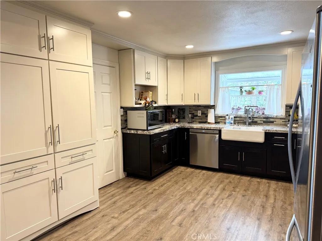 The kitchen is a standout, featuring granite countertops, a rustic farm-style sink, custom cabinetry, and a bright bay window that brings a touch of elegance to the heart of the home. Both bathrooms boast custom tiled surrounds and updated vanities—one with a first-floor shower and the other with a second-floor soaking tub.