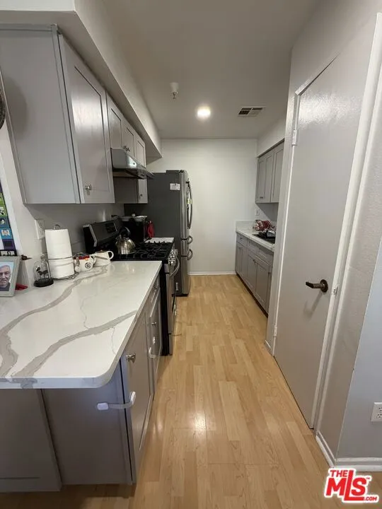 Spacious 2-bedroom, 2-bath first-floor condo with approximately 1,100 sq ft of comfortable living space. Bright and airy unit features an open floor plan, large living room, updated kitchen and bathrooms, recessed lighting throughout, and wood-style flooring. Includes in-unit washer/dryer hookups, central A/C and heating, and abundant natural light. Secure building with elevator access, gated parking, and live security cameras in common areas. Enjoy a small private garden at the front door, for your own plants. Currently vacant. Text listing agent to schedule a showing.