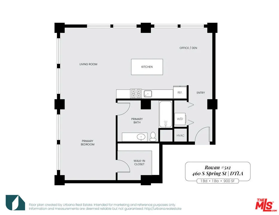 Gorgeous CORNER loft with a spacious floor plan and massive walk-in closet in The Rowan Building, the crown jewel of Downtown LA’s Historic Core. Unit 512 is a spacious condo with a functional modern loft layout, abundant original windows, and exposed brick. At ~900 SqFt, this is one of the largest 1/1 layouts in the building. The kitchen boasts ample countertop and storage space, the bedroom area provides generous space and the option for privacy, and the walk-in closet contains an enviable amount of built-in storage that is rare to find in a downtown loft. The interior of the unit tastefully blends historic character with modern finishes and comforts, including hardwood floors, soaring ceilings, Scavolini cabinetry, stainless Bosch appliances, central HVAC, and an in-unit laundry closet with even more storage. A primary bath with generous proportions includes stone tile, an extra-deep soaking tub, and high-end Toto fixtures. Two walls of huge, mahogany-framed windows bring in an abundance of natural light to the unit and provide views to the gorgeous architecture of the surrounding cityscape. Originally built in 1912, the historic Rowan Building was designed by famed LA architects Parkinson & Bergstrom in the iconic Beaux-Arts style. In 2009, the building was extensively restored and converted into live-work condominiums. Historic details have been preserved including exposed brick walls, Carrara marble corridors, and Art Deco elevator doors. The property boasts countless amenities including 24/7 security and concierge, bike storage, and resident lounge. Perfectly-manicured outdoor spaces include a lush tropical garden, pet relief area, hot and cold plunge pools, outdoor seating with fire pits, and built-in gas BBQs. The Rowan is perfectly situated within the vibrant Historic Core neighborhood: adjacent to Spring Street Park, convenient to two Metro stops, and surrounded by the countless restaurants, culture and nightlife options that comprise the quintessential downtown lifestyle. This is the DTLA lease opportunity that you have been looking for! Showing by appointment. Tenant pays Electric and Internet. Parking and storage available for an additional fee.