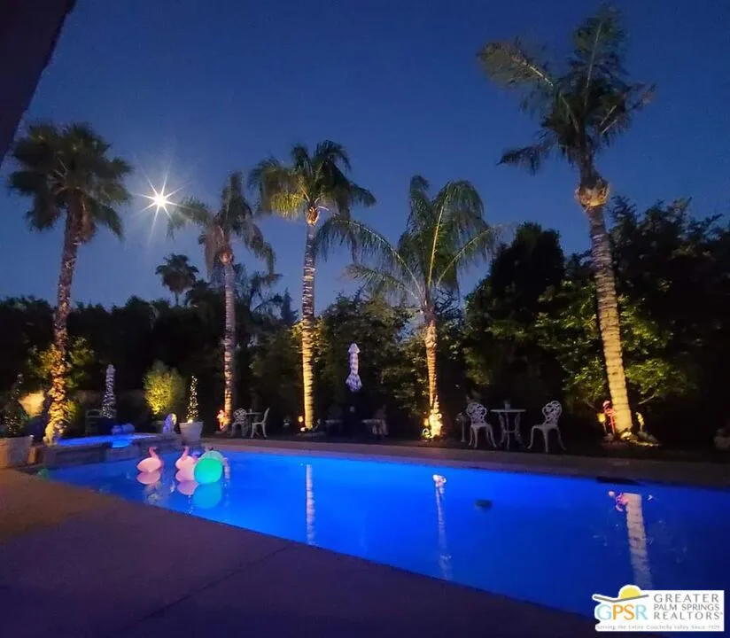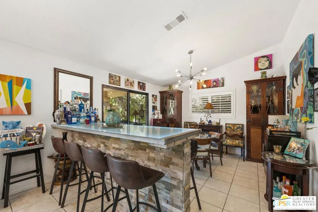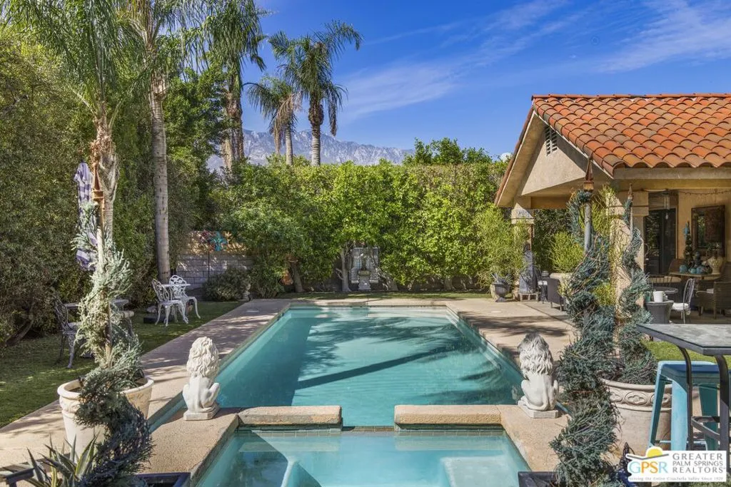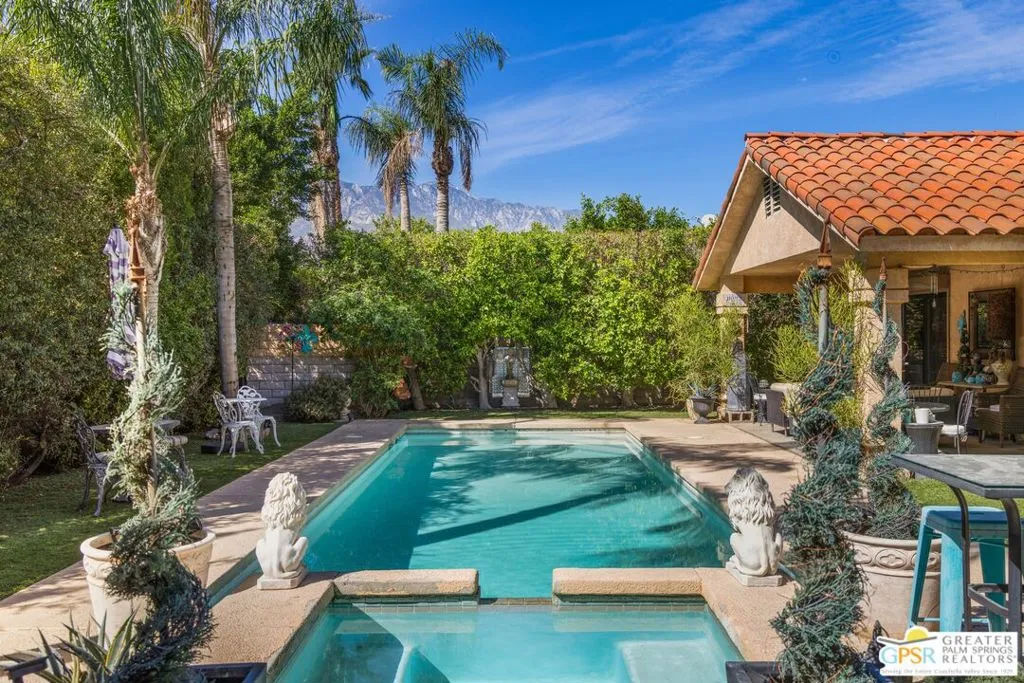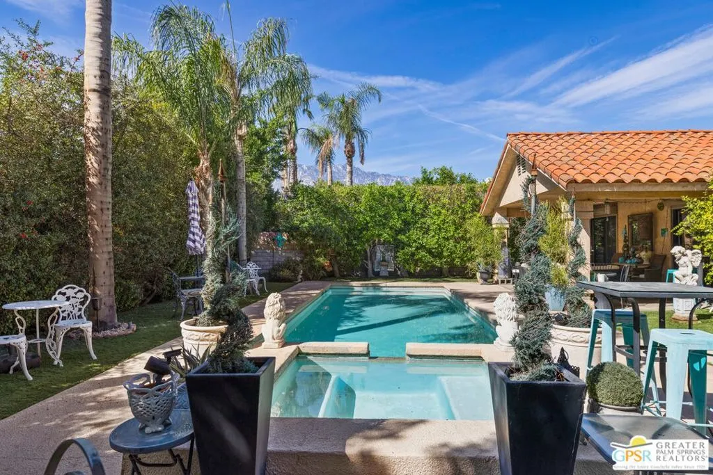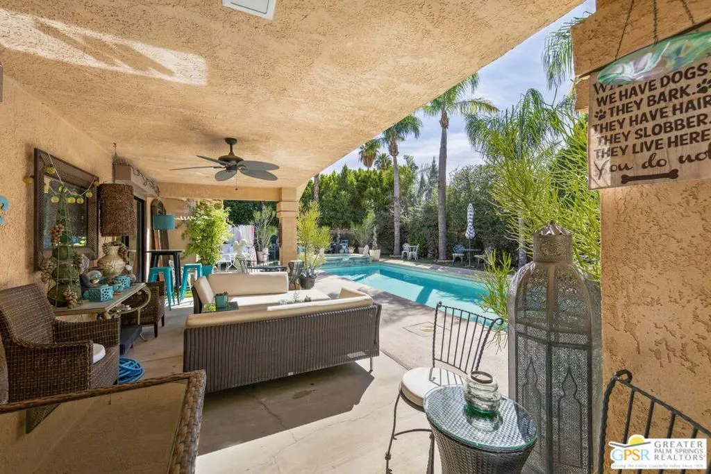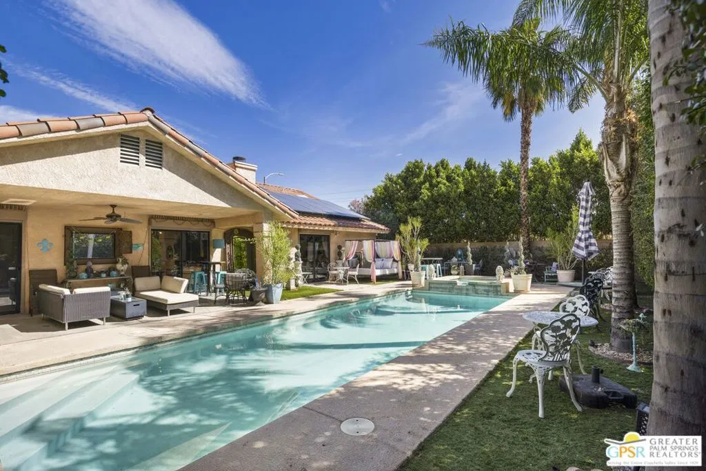Welcome to your new home! This three bedroom three bath pool home has an abundance of natural light through the many sliding doors and windows throughout the home, all with custom shutters. A wonderful place to entertain, this home has a show stopper custom designed and built bar in the dining area, which allows for dinner seating for up to 8 people. Beautiful redone fireplace in the living room creates a tranquil environment. Step out into the back yard and imagine the possibilities. A large covered patio with ceiling fans is a perfect area to dine al fresco. The pool is 36 feet long with raised spa and waterfall. You can swim laps or entertain guests. A truly magical place to unwind! Synthetic grass in the front and back provide a low maintenance yard. Owner owned solar system provides most of your electricity, making this home very efficient. A two car garage has an additional storage room, which could be used for a golf cart or as a workshop. Plenty of storage. Come see this exciting home before it’s too late!