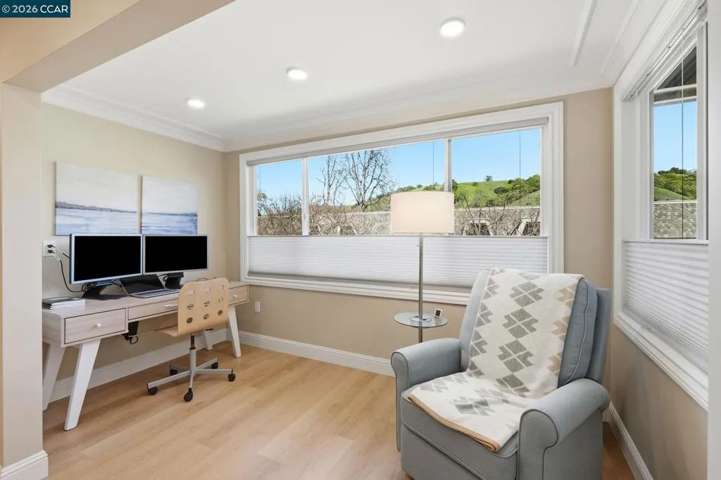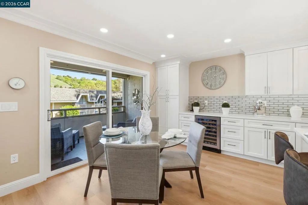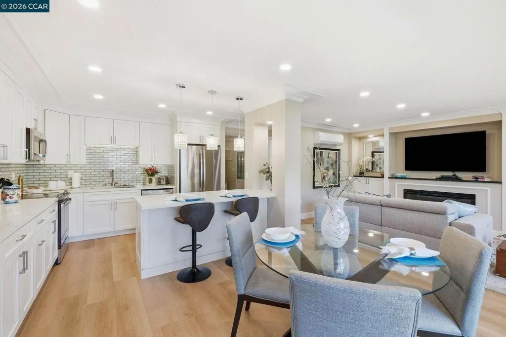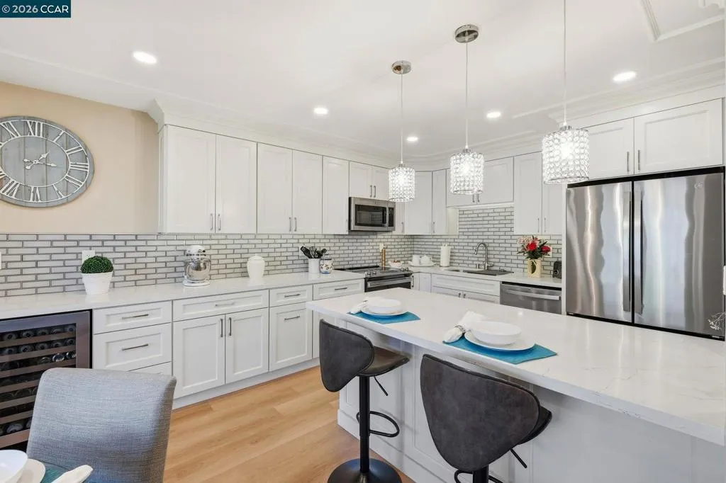 Beautifully reconfigured Claremont model featuring the rare addition of a second full bathroom. Half of the balcony has been enclosed to create a bright office/den, adding flexible living space. Recently updated energy-efficient mini-split systems in each room provide personalized heating and cooling. The remodeled kitchen offers white cabinetry, quartz countertops, stainless steel appliances, breakfast bar, pull-out pantry drawers, built-in recycling/trash, and a wine fridge. Additional upgrades include dual-pane windows and engineered hardwood flooring throughout. The private primary suite features a step-in shower and linen closet, while the guest bath includes a soaking tub with beautifully tiled walls. Spacious utility closet fits washer/dryer. Carport nearby with guest parking just outside the front door.