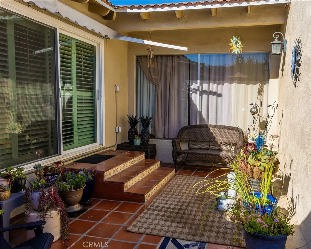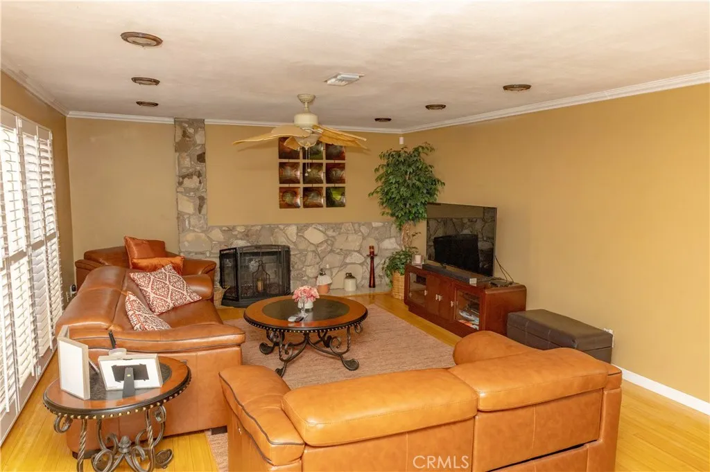 Step through the double-door entry into a warm and welcoming living room featuring a classic fireplace, crown molding, and a sliding door that opens to a beautifully tiled patio—perfect for morning coffee or evening relaxation.
