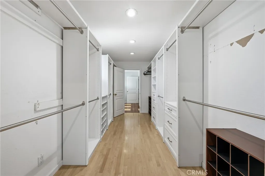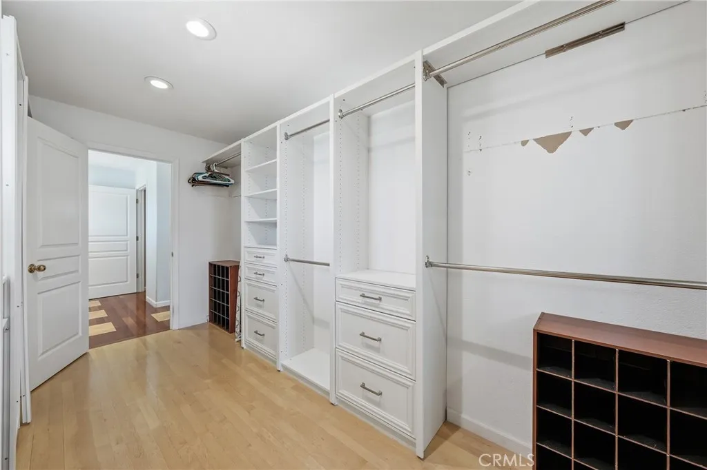 The spacious floor plan features hardwood flooring, vaulted ceilings, and a sunken living room with a marble surround gas fireplace. A formal dining room connects to the large chef’s kitchen, complete with granite slab countertops, custom cabinetry, a large island with utility sink, double ovens, propane cooktop, pantry, built-in microwave and warming tray, and a commercial-sized refrigerator/freezer. The kitchen opens to an additional living area with a built-in wet bar, beverage refrigerator, granite desk workspace, and sliding glass doors leading to a large deck overlooking the backyard.