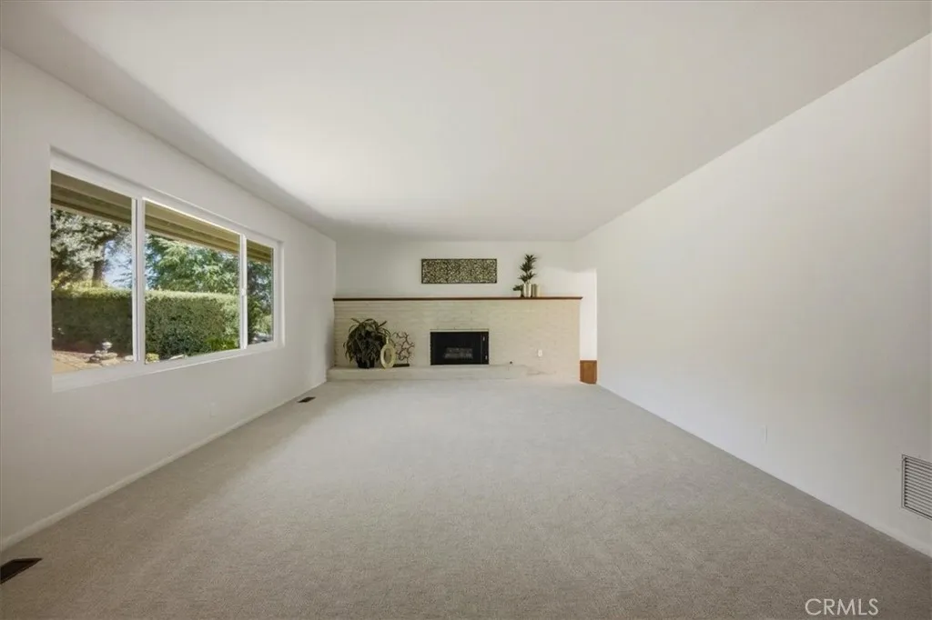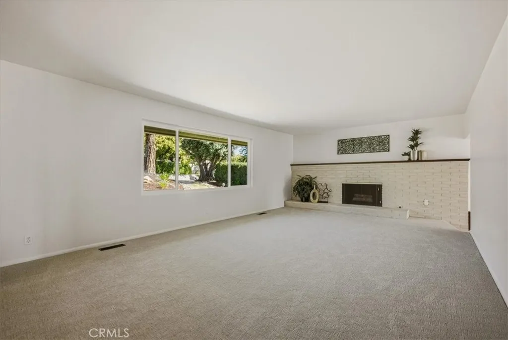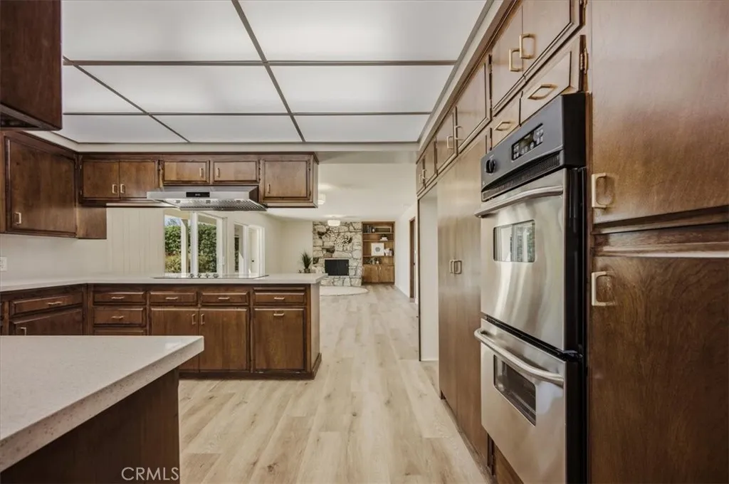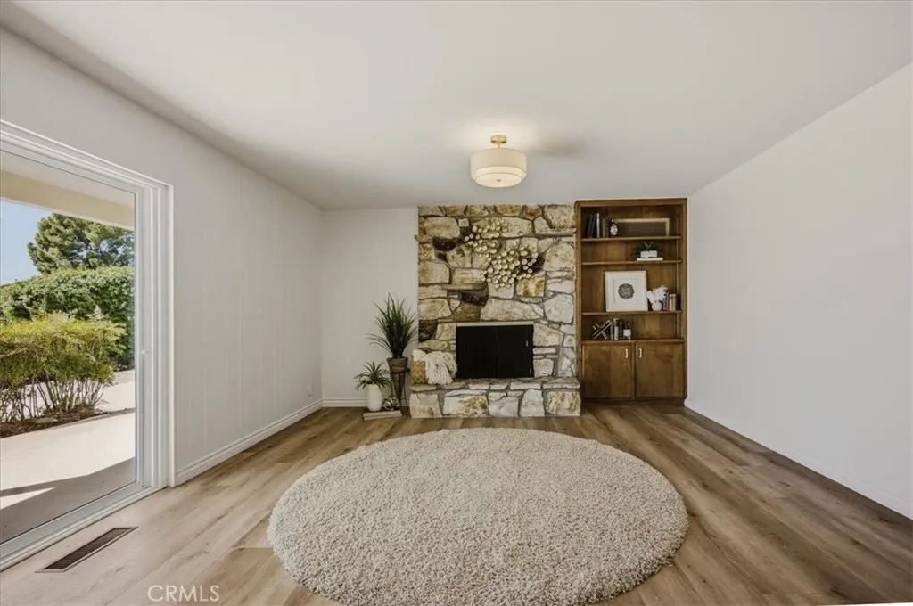 The family room features a striking rock fireplace and flows seamlessly into the updated kitchen, creating a bright, open-concept layout. The kitchen boasts quartz countertops, stainless steel appliances, and timeless walnut cabinetry. Two expansive sliding glass doors flood the space with natural light and provide stunning views of the backyard and city lights beyond.