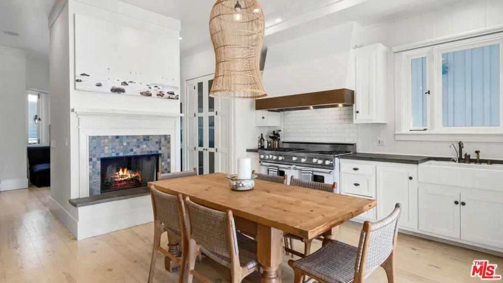 This Cape Cod-style home on Trancas Beach blends Malibu’s coastline with effortless, luxurious living. Set on a wide, flat stretch of sandy shoreline, this residence offers expansive ocean views and ample space for indoor-outdoor living and entertaining. A gated entry opens to a charming breezeway, leading to a private courtyard featuring a flagstone fireplace, lounge seating, and a covered Jacuzzi with a waterfall.Freshly updated inside and out, the property includes a two-bedroom, one-bath guesthouse with its own kitchen, gym area, living room with fireplace, and abundant natural light. Accessible either from within the main house or through a separate courtyard entrance, the guesthouse offers privacy and flexibility for visitors or extended stays. The main house showcases light-toned wood floors and ocean views from the moment you step inside. Off the entry, a bonus/media room is equipped with a pool table, Stewart projection screen, en-suite bathroom, and French doors opening to the courtyard. A powder room and laundry room are also conveniently located off the entry hall.The country-style kitchen is the heart of the home, featuring a cozy fireplace, stone countertops, high-end appliances, and ample cabinet space. The kitchen connects to both the family room, which opens to the courtyard, and the living room, where ocean views take center stage. The living room boasts a fireplace and three sets of French doors that lead to a newly renovated, heated beachfront deck. This outdoor space is perfect for dining, lounging, and entertaining, complete with a Weber barbecue, firepit, and steps down to the sandy beach.An additional bar-lounge area enhances the living room’s appeal, while the formal dining room, with its fireplace, flatscreen TV, and ocean views, offers a sophisticated setting for meals. A large double-sided fish tank, visible from both the dining room and hallway, adds a unique touch.The upper floor houses three bedrooms, each with balcony access. The primary suite is a luxurious retreat with vaulted ceilings, a fireplace, a sitting area with stunning ocean views, custom closets, a spa-style bath, and an oceanfront balcony with seating. Both the main house and the guesthouse are air-conditioned for comfort.Additional features include an outdoor shower in the side yard, three garages facing the street, and easy access to Trancas Country Market, a short walk away with its shops and dining options. This oceanfront getaway epitomizes Malibu living, with its perfect blend of style, comfort, and breathtaking views. $95,000 per month during the summer months.