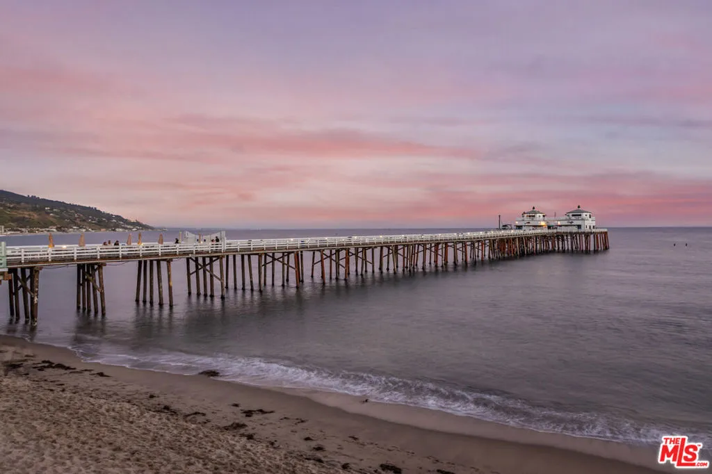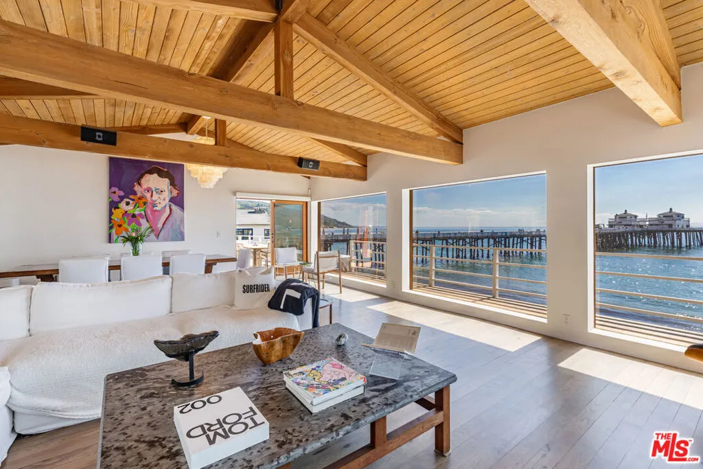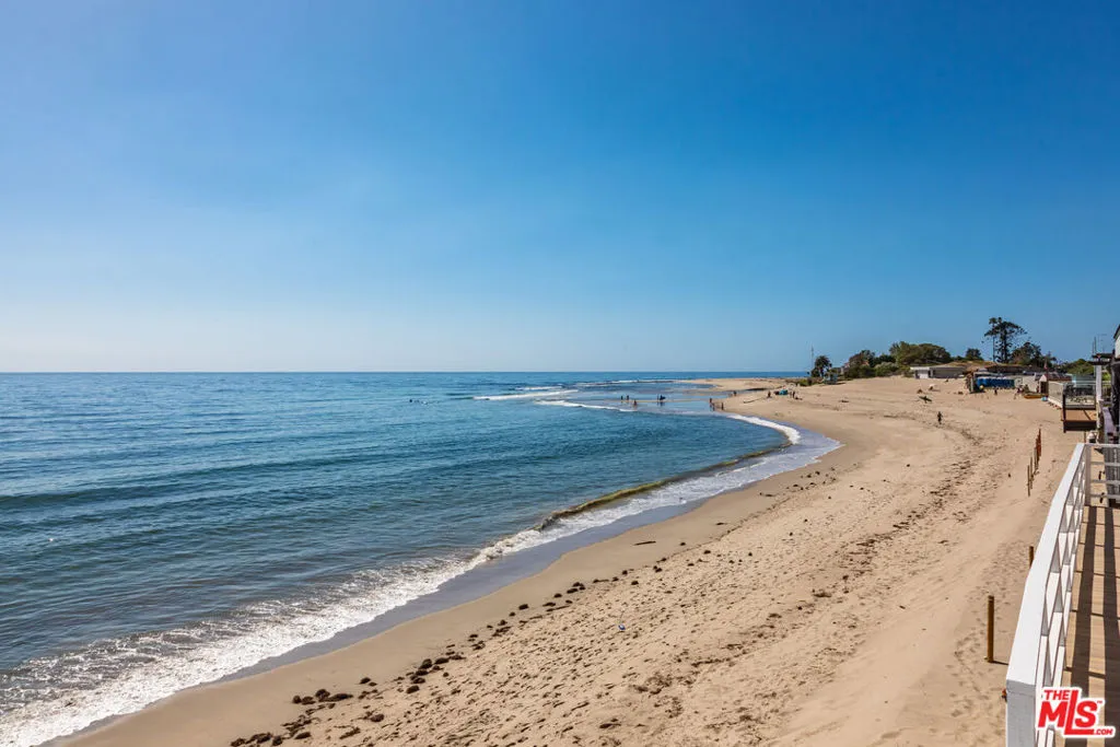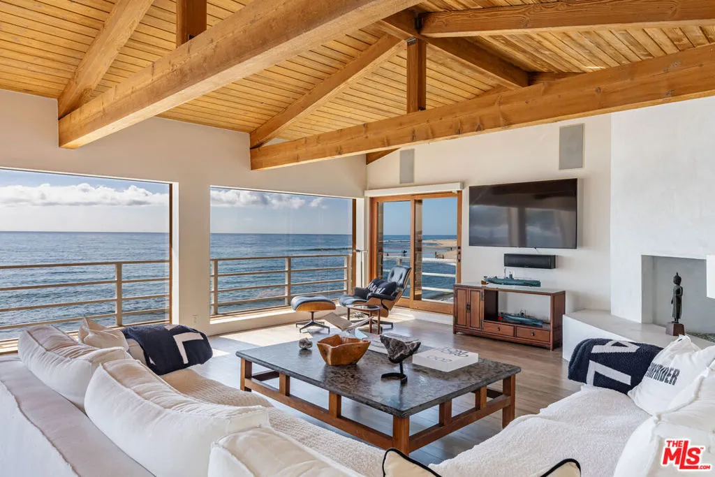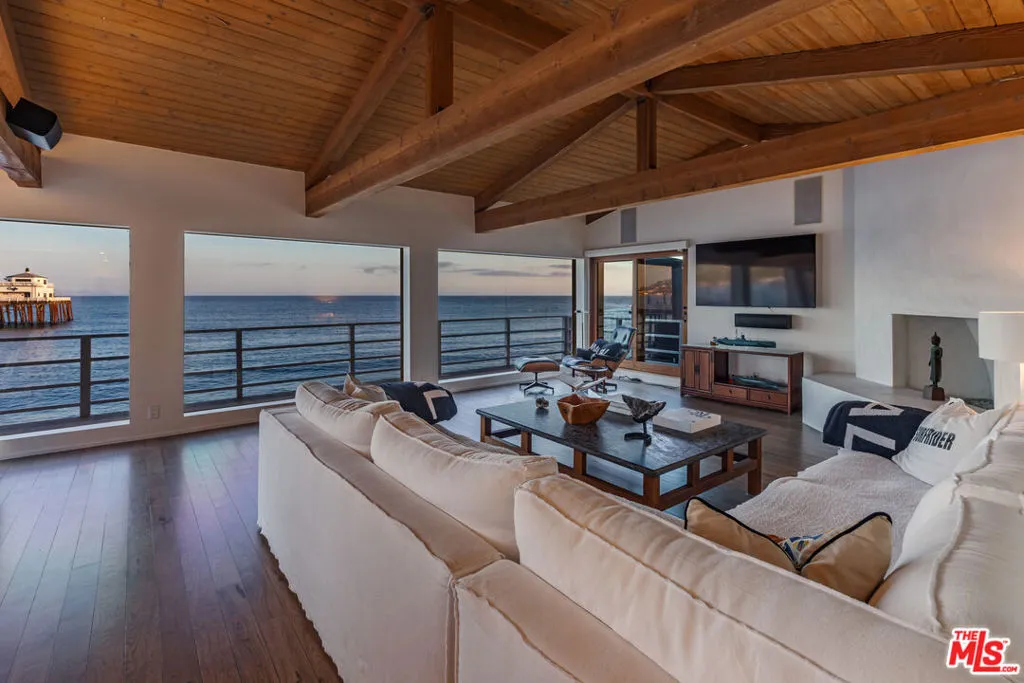 Introducing a rare double-lot beachfront sanctuary with 74 ft of ocean frontage on Malibu’s coveted Surfrider Beach. The owner is offering the adjacent 40-foot oceanfront parcel for sale separately, creating a rare trophy oceanfront compound with approximately 114 feet of direct frontage on the legendary Surfrider Beach overlooking the iconic Malibu Pier. Pricing for the parcel available upon request. This single-story coastal retreat blends sweeping panoramic ocean views with architectural elegance. A gated arrival opens to a motor court with ample parking and a private garage. The expansive living/dining pavilion features vaulted ceilings, hardwood floors, a fireplace, and three oversized ocean-facing windows framing the Malibu Pier vistas. Glass doors lead to a wraparound porcelain-tiled oceanfront deck perched above the sand, creating a seamless indoor – outdoor setting ideal for entertaining against the backdrop of Surfrider beach. The gourmet kitchen includes a granite island, skylights, Sub-Zero and Thermador appliances, plus captivating ocean views. The luxurious primary suite offers exceptional privacy with a marble gas fireplace, sliding doors that open to the deck, showcasing the Pier panorama, an oversized walk-in custom closet, and spa-like bath featuring steam shower, soaking tub, and heated floors. Three additional bedrooms (two ensuite) provide stylish accommodations with sunset deck access. Modern upgrades include a whole-house generator, EV charger, Sonos system, and porcelain flooring in the primary suite and deck. With a proven rental history, partial seawall protection, and a prime location in the heart of Malibu near Nobu, Soho House, Malibu Farm and the Malibu Country Mart, this refined oceanfront estate delivers rare scale, prestige, and unforgettable views of the Pier, Catalina and the Queens necklace.
