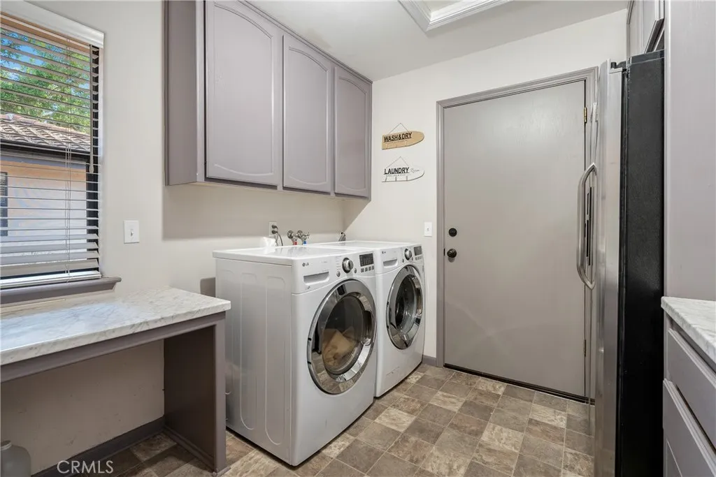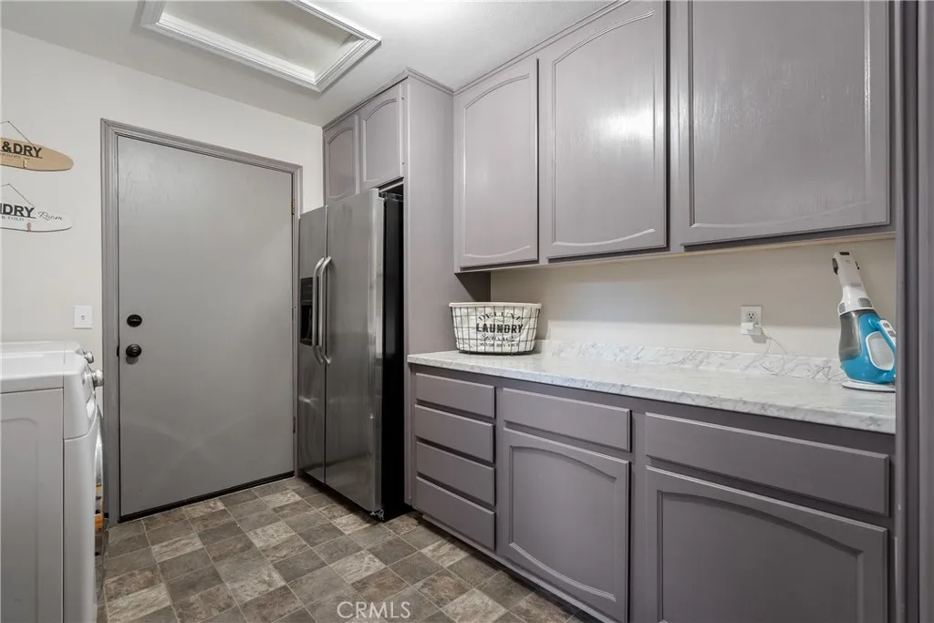 Additional highlights include a generous laundry room with abundant storage and a refrigerator, leading to an oversized 2-car garage with built-in workbenches and extra storage areas.