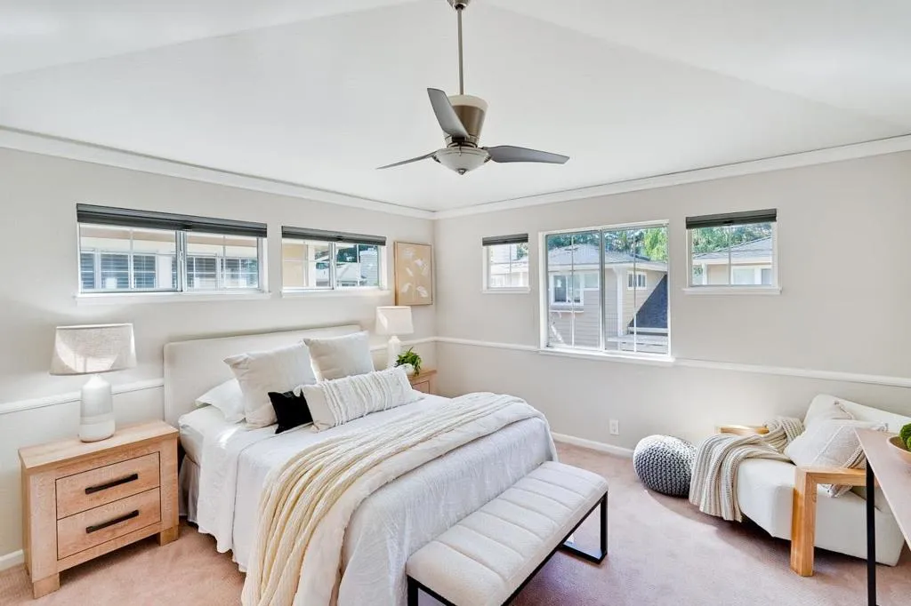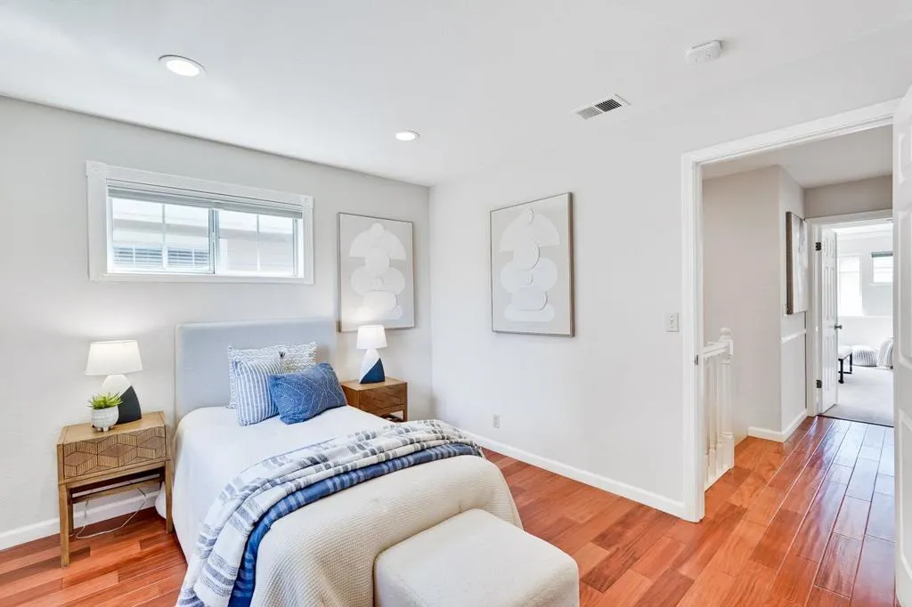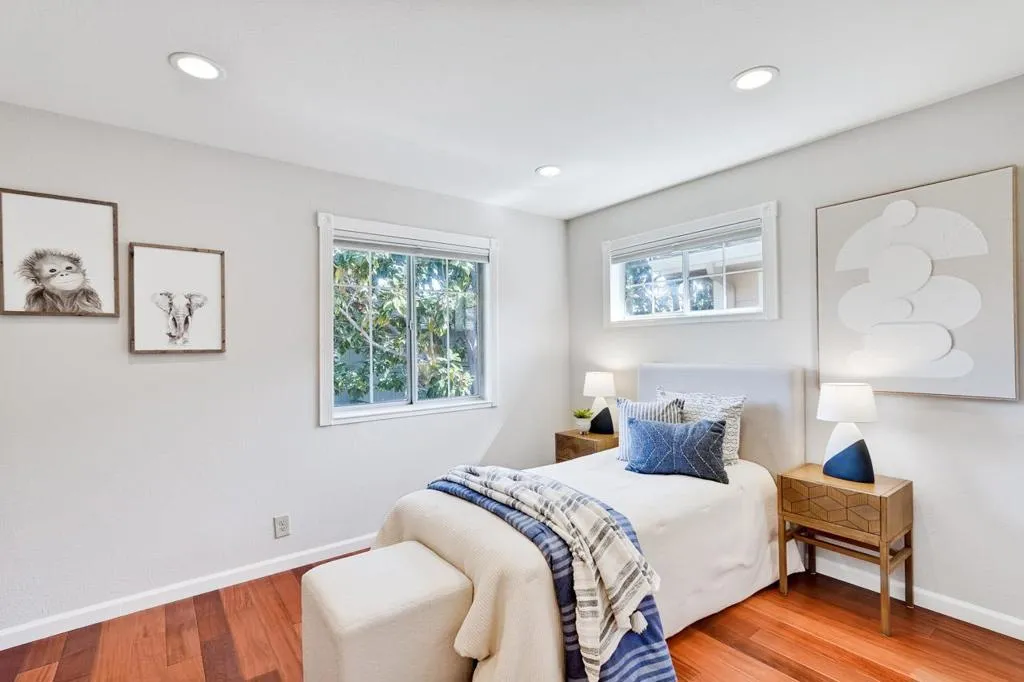Ideally located near Google, Costco, and major commute routes, this beautifully updated 3-bedroom, 2.5-bath townhome offers 1,606 sq.ft. of bright, thoughtfully designed living space with enhanced privacy. The home features rich mahogany hardwood floors, brand new carpet, and smart LED recessed lighting with upgraded switches throughout. The inviting living room includes a fireplace, while the kitchen is equipped with elegant stone countertops, counter seating, and a rare dual-fuel range with gas cooktop and electric oven. The spacious primary suite offers a large walk-in closet and a spa-inspired bath with dual vanities and an oversized shower. Enjoy a rare wraparound yard with bluestone, synthetic turf, and a powered patio coverperfect for relaxing or entertaining. Only one shared wall at the garage enhances privacy. Additional features include remote-controlled blinds, skylight, tankless water heater, central AC & heating, in-unit laundry, and 220V EV charging outlet. Includes 1-car garage plus 1 assigned parking. Served by Monta Loma Elementary, Crittenden Middle, Los Altos High, and close to shopping, dining, parks, and major commute routes.